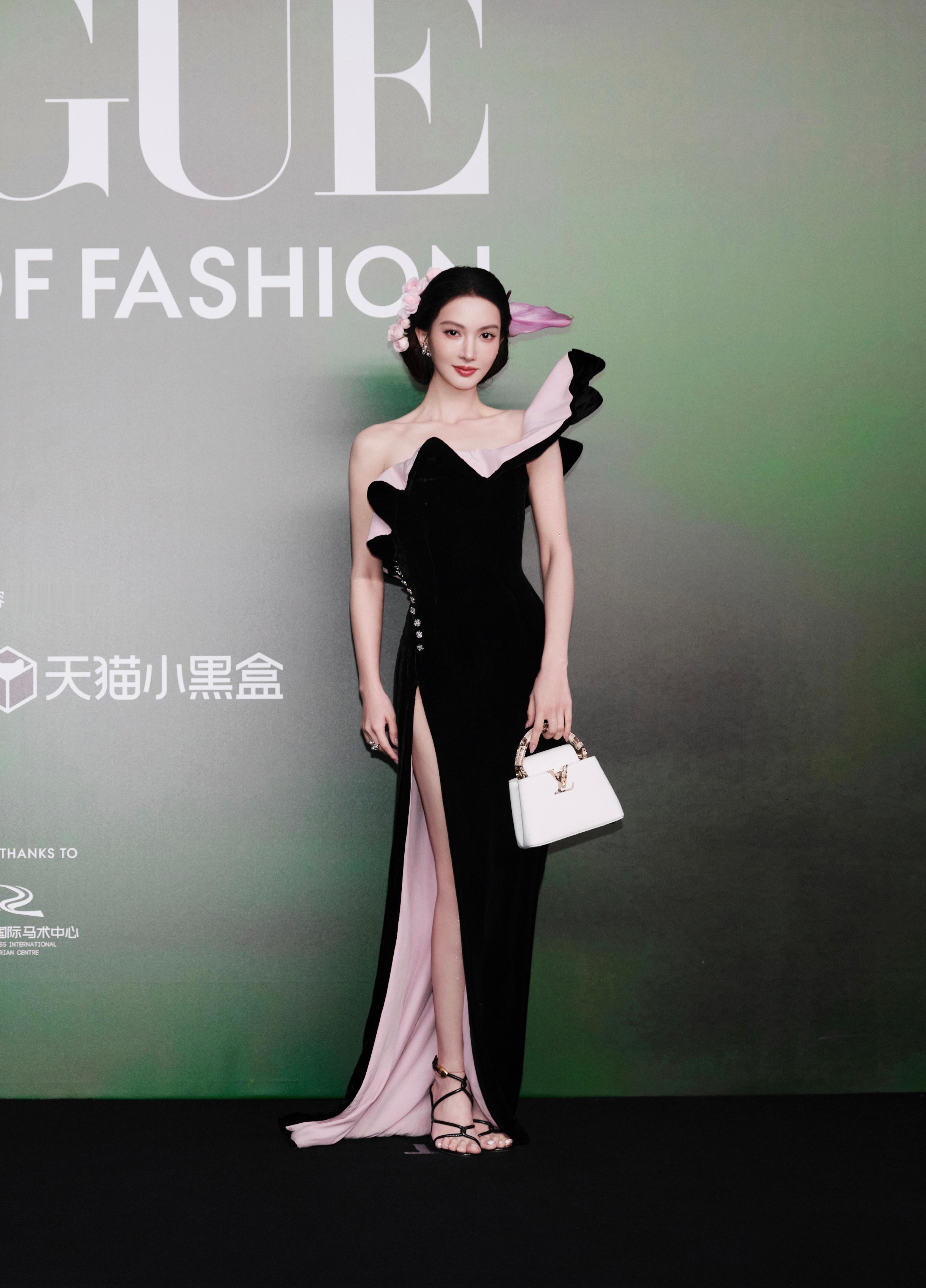金晨 美腿修长笔直,在裙装的映衬下更显纤细匀称;肩颈线条精致优雅,露肩设计将其骨感又不失柔美的轮廓完美展现。
