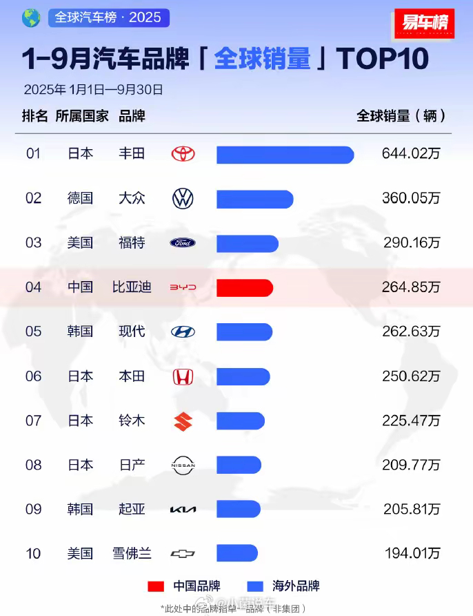 有媒体统计并发布了《2025年1-9月汽车品牌全球销量TOP10》排行榜。从国家分布来看,日本品牌占据四席,展现出汽车强国的雄厚实力;美国两席,韩国两席,德国、中国分别占据一席。