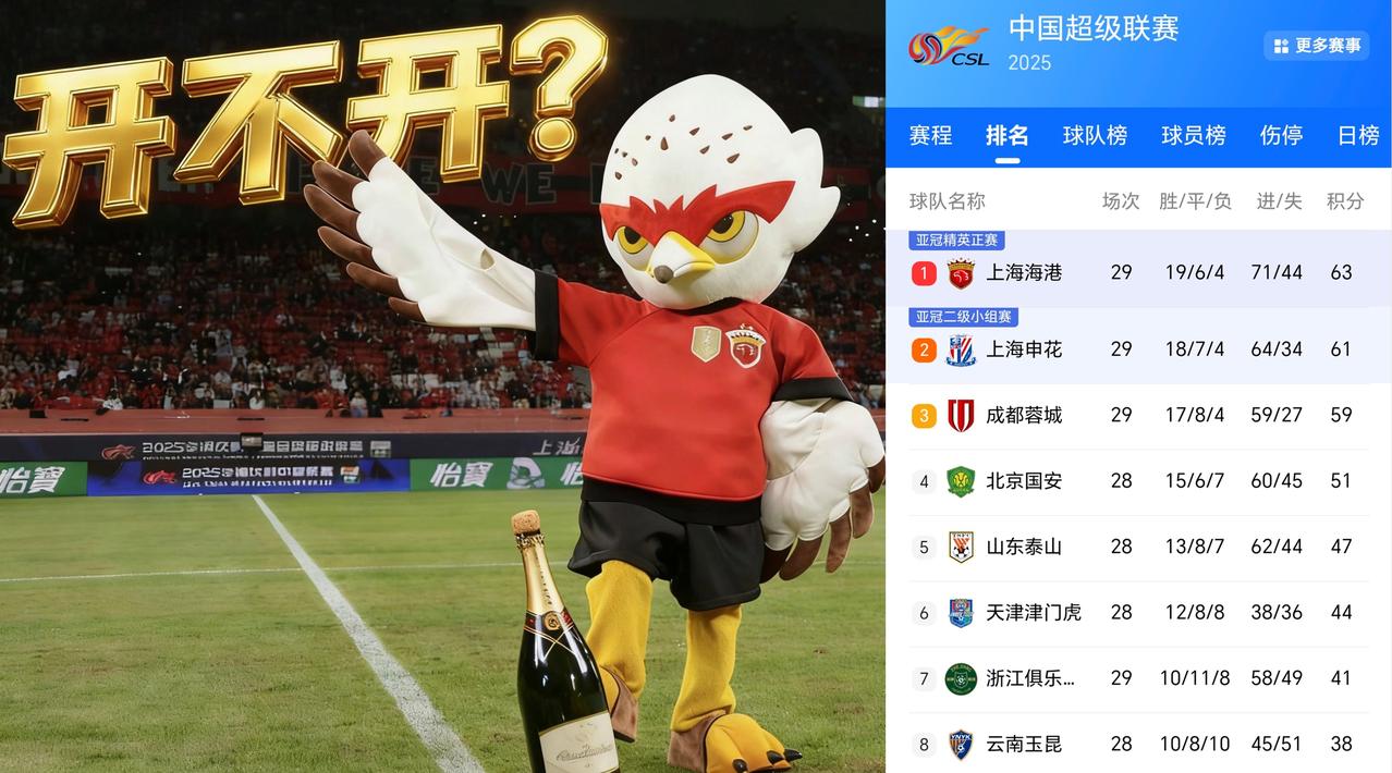 现在上港可以开香槟了吧?最后一轮申花客场胜天津难于上青天啊。 上港球迷总说不要学隔壁,不要提前开香槟,败自己人品的事坚决不做,联赛还没结束,不到最后不言胜败。 不过我觉得这次完全可以提前开了,上港客场输大连的概率太低了,而且申花客场真不一定能拿下天津。 其实上港已经99.9%就是冠军了!成都昨天“拔管”真的太重要了。申花也只剩理论上的可能了。