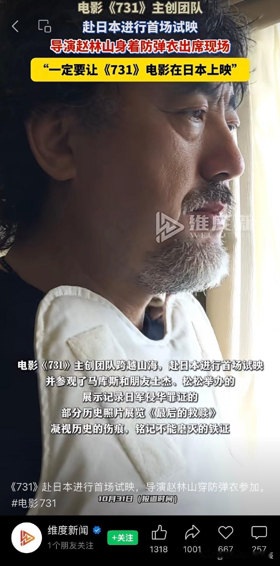 父老乡亲们,你们见过穿防弹衣放电影的吗?导演赵林山就这么干了! 他带着电影《731》去日本试映,防弹衣一穿,不是怂,是把民族伤疤亮给该看的人。咱这代中年人,谁没听老人讲过当年?历史就像老家的旧伤疤,可以结痂,但不能被磨平。他这身“铠甲”护着的不是自己,是千万同胞不敢忘的记忆。 兄弟们,假如你在现场会想对观众说点啥?评论区唠唠[吃瓜群众]