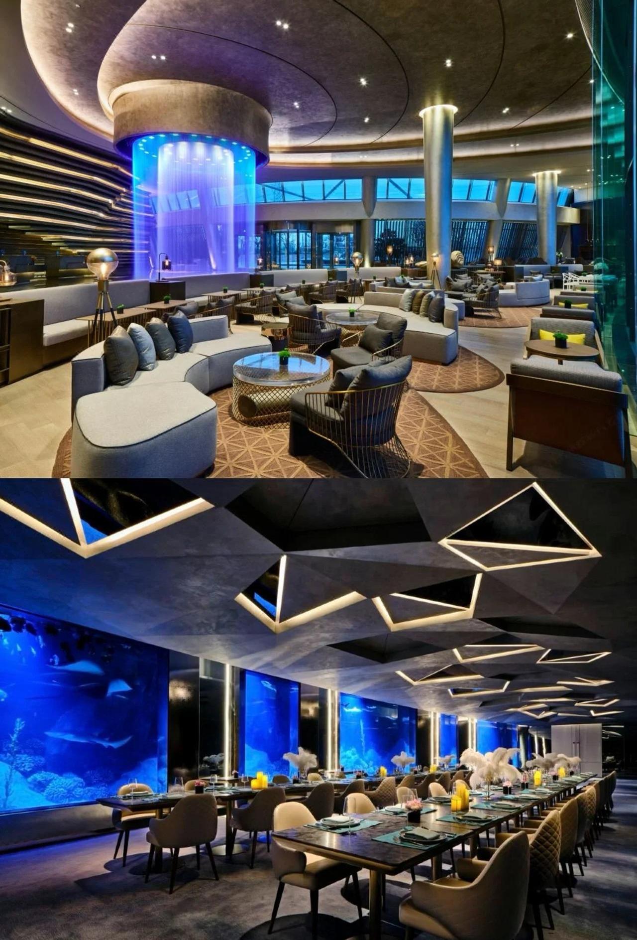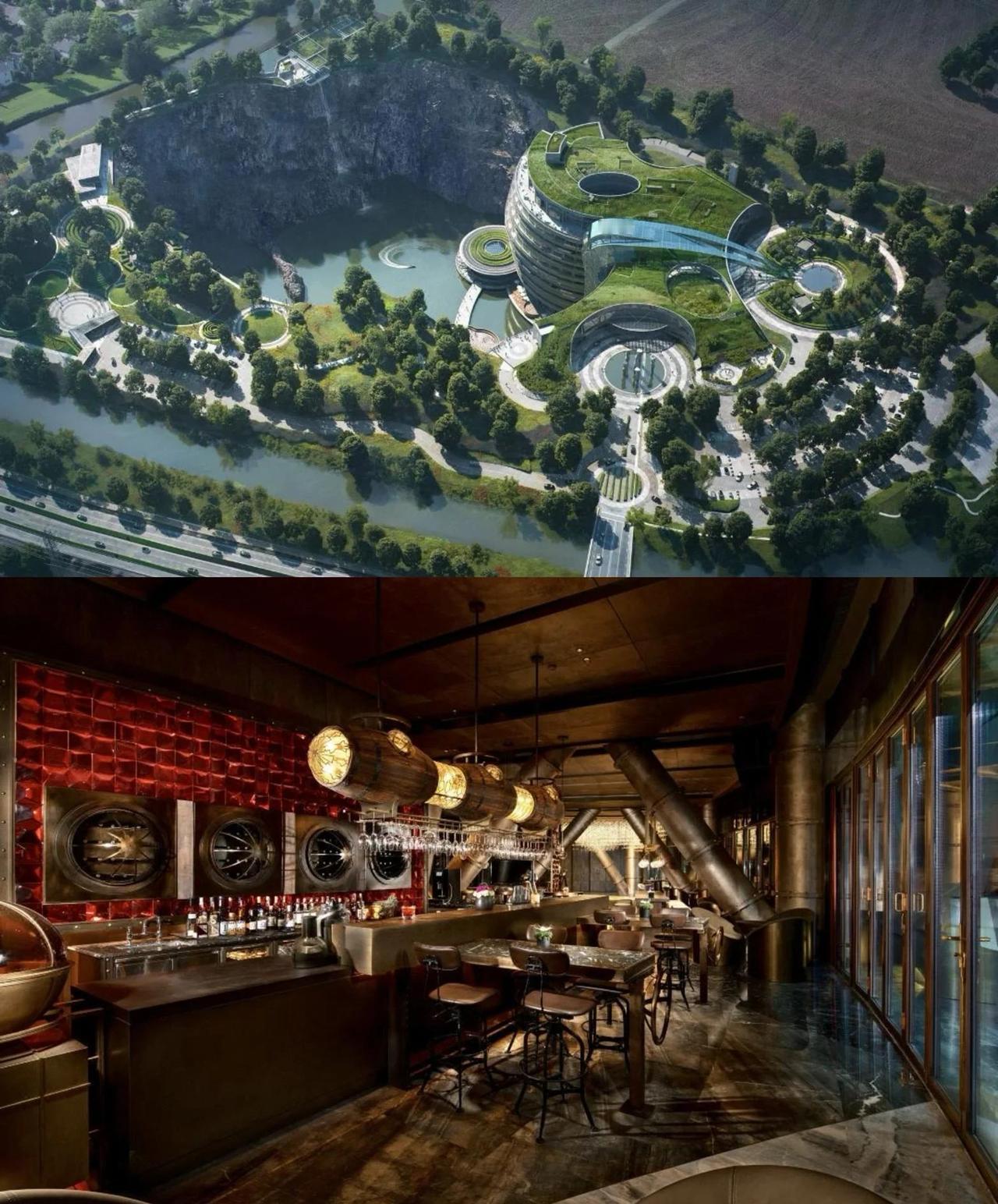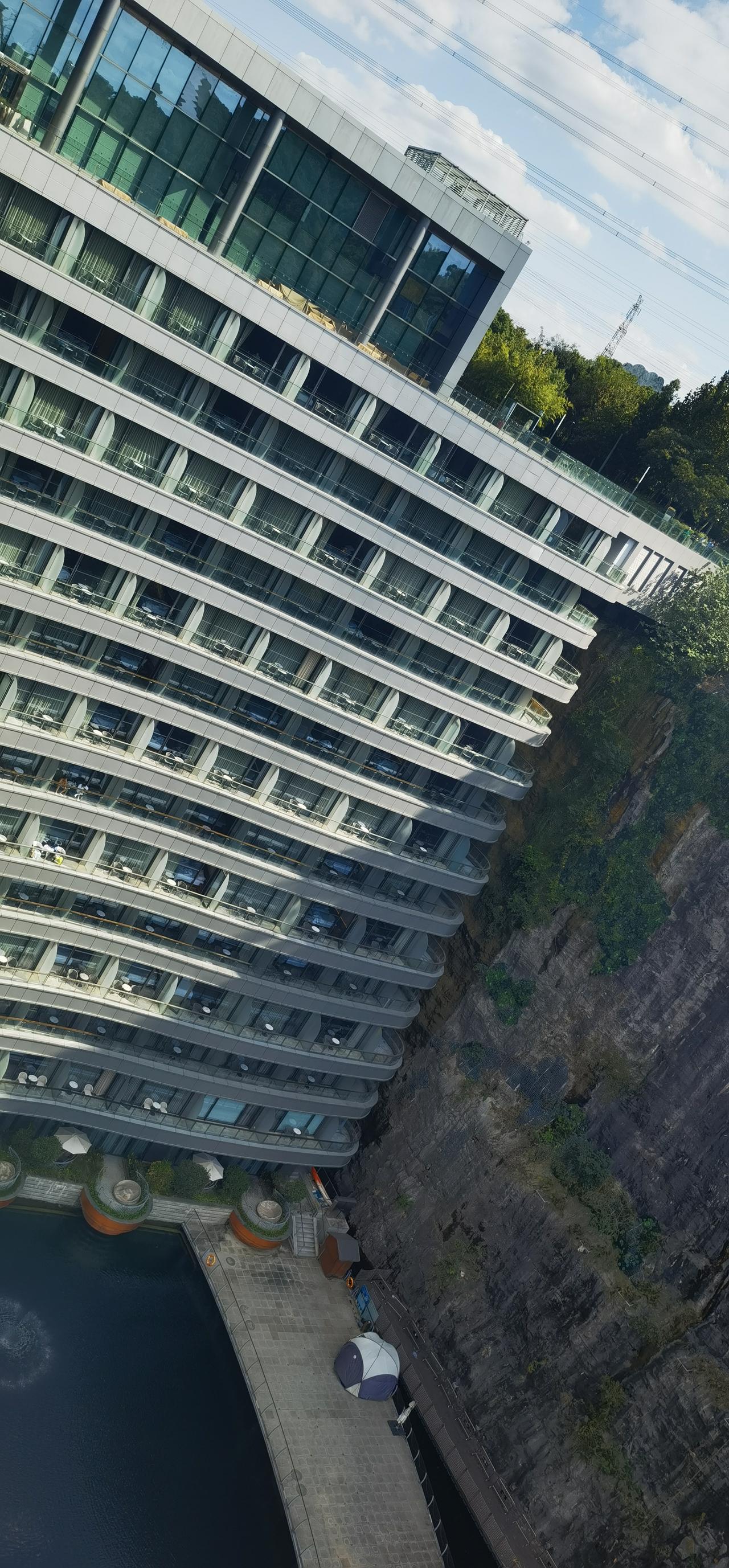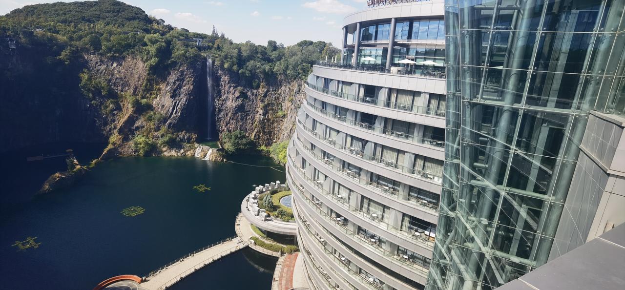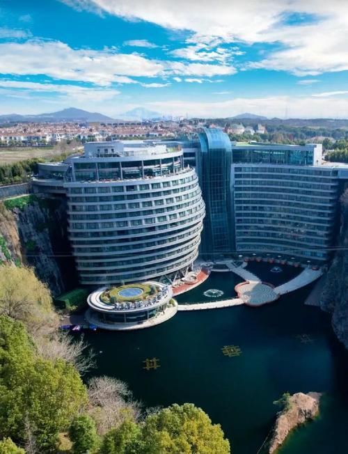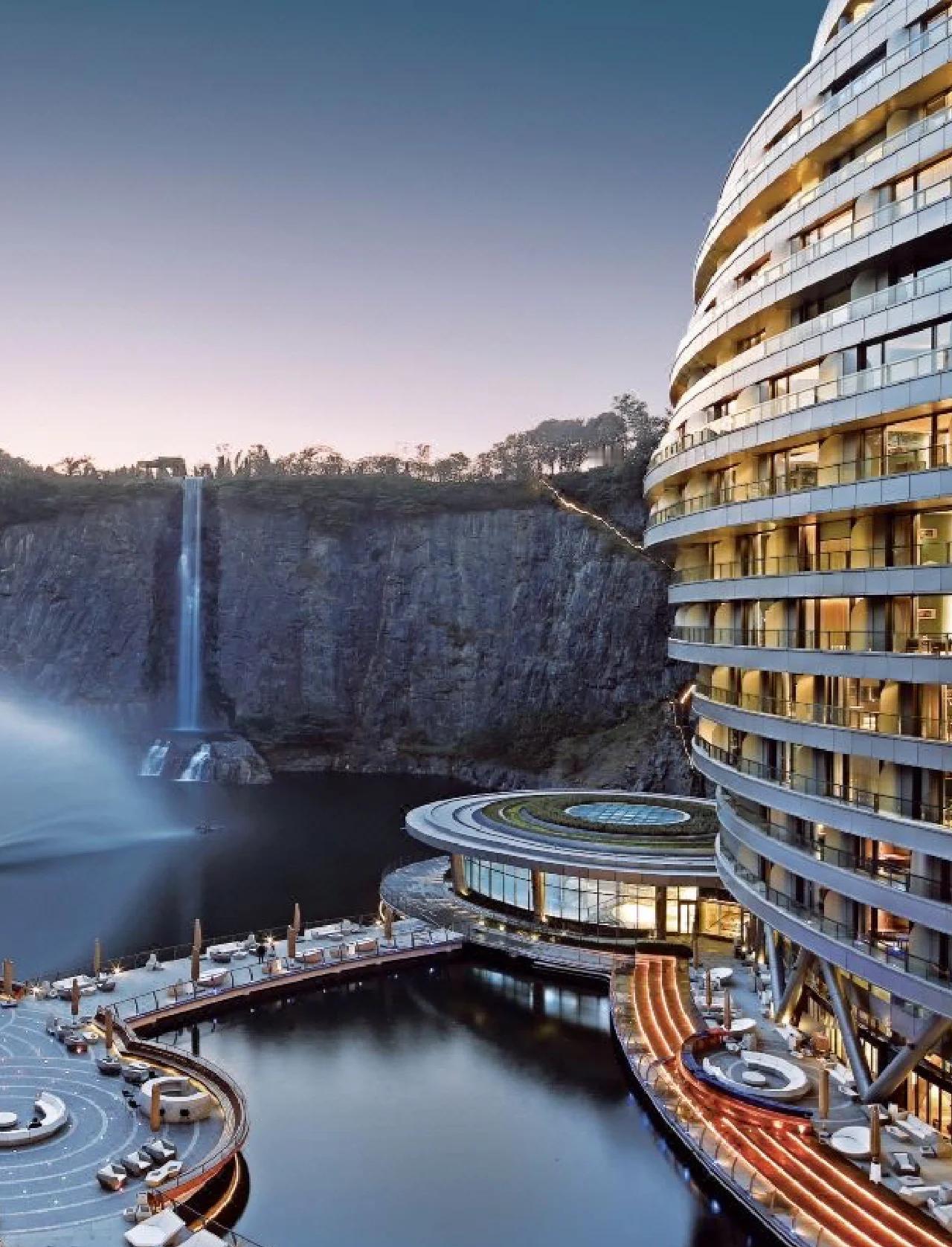 太震撼了!想象力太深奥了! 之前就看到过深坑酒店在建时的报道,今天终于来了。体验后真的超出认知!它深入地下88米,建造历时12年,总投资超20亿,还创下41项专利,被美国国家地理誉为“世界建筑奇迹”,和迪拜帆船酒店同入选世界十大建筑奇迹。 建筑用了10000吨钢材、14000只各异的钢构件。只有2层在地上,其余15层全在地下,呈突出半球体。大堂3D投影动态水幕超炫,建筑与崖壁、瀑布、水潭、山丘融为一体,仿佛自然生长。这简直是把“自然伤痕”变成了瑰宝,太震撼!