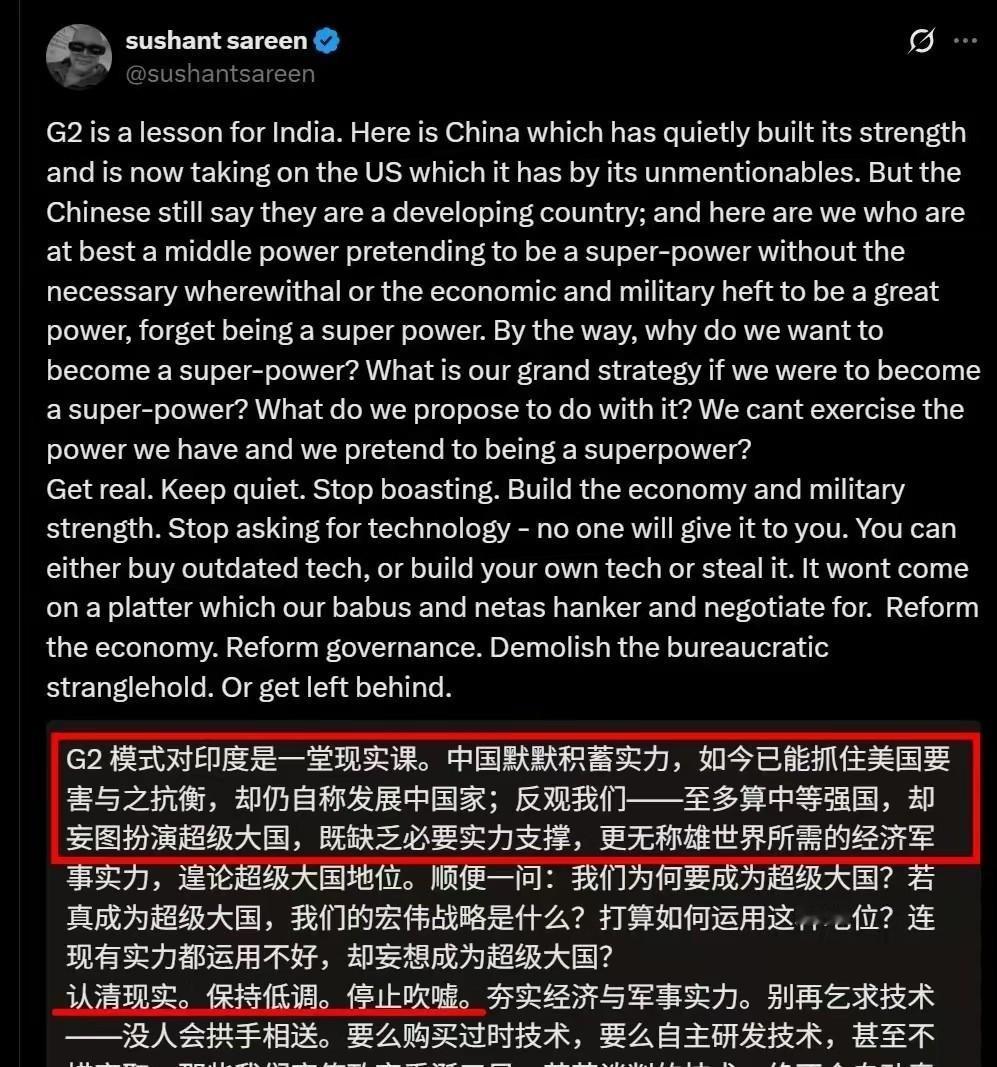 这个世界上还是看中美关系,中美关系一缓和,特朗普发布了G2以后,世界开始不淡定了。 特朗普在社交媒体上喊出G2时代来临,这可不是随便说说的客气话,那是美国不得不承认中国实力地位的实在表现,过去几个月中美之间从稀土较量到港口费过招,美国发现以往那套单边施压根本行不通了,中国不仅没被压垮反而在高端制造和数字经济领域不断突破,美国自己反倒被稀土卡了脖子,从F35战斗机到苹果手机都离不开中国的稀土供应,这种结构性依赖让美国只能放下身段寻求平等对话。 印度那边反应最有意思,一直以为自己能靠美国制衡中国,结果特朗普反手就对印度加征关税,半导体药品农产品出口全被打压,莫迪政府这才恍然大悟,所谓联美制华战略彻底破产,印度国内开始出现反思声音,国大党海外部门负责人公开说印度不应将中国视为敌人而要尊重中国发展,虽然立刻被印人党抨击,但这种反思声音在以前根本不可想象,印度现在陷入一个怪圈,对抗中国越狠对华依赖反而越深,制药业90%的活性药物成分还得从中国进口。 欧洲国家表面镇定内心早就慌成一团,嘴上说着乐见中美对话,心里生怕两个大佬达成协议后把自己晾在一边,欧盟既希望中美缓和能缓解经济压力,又担心中美走近后欧洲利益被忽视,在数字税气候变化这些议题上欧盟还需要同时争取中美支持,现在中美真要平起平坐谈合作,欧洲突然发现自己可能要从棋手变棋盘了。 日韩澳大利亚这些美国传统盟友更是尴尬,韩国原本想在中美之间扮演桥梁角色,结果发现金融上受制美国制造业又离不开中国,平衡策略难以为继,日本首相高市早苗虽然对特朗普极尽谄媚,最终还是得接受对美投资5500亿美元的要求,澳大利亚则担心特朗普对奥库斯联盟的态度是否会变,菲律宾总统马科斯第一时间祝贺特朗普当选,急着表忠心要打造牢不可破的同盟,这些小国突然意识到跟着美国跑未必有肉吃,说不定还会成为大国博弈的牺牲品。 东盟国家一贯在中美之间搞平衡,经济上靠中国安全上靠美国,现在他们也发现这套策略越来越行不通,一方面美国不愿承担过多安全责任,另一方面对中国经济依赖越来越深,这些国家现在最希望的就是中美在亚太地区和平竞争而不是逼着小国选边站,泰国柬埔寨马来西亚趁着特朗普来访赶紧签关键矿产协议,想减少对稀土的单一依赖,但谁都明白真正要解决问题还得看中美脸色。 现实摆在眼前,中美两国GDP总和占全球43%,几乎半壁江山,这种经济实力决定了两国在国际事务中的主导权,俄罗斯欧洲日本已经被请到另外一桌,未来五十年没有任何经济体能够挑战中美的地位,关键就看中国什么时候超越美国成为第一大经济体,特朗普接受G2概念说明美国终于认清现实,在这个靠实力说话的世界里,中国的崛起已经改变全球格局。 各位读者你们怎么看,欢迎在评论区讨论。