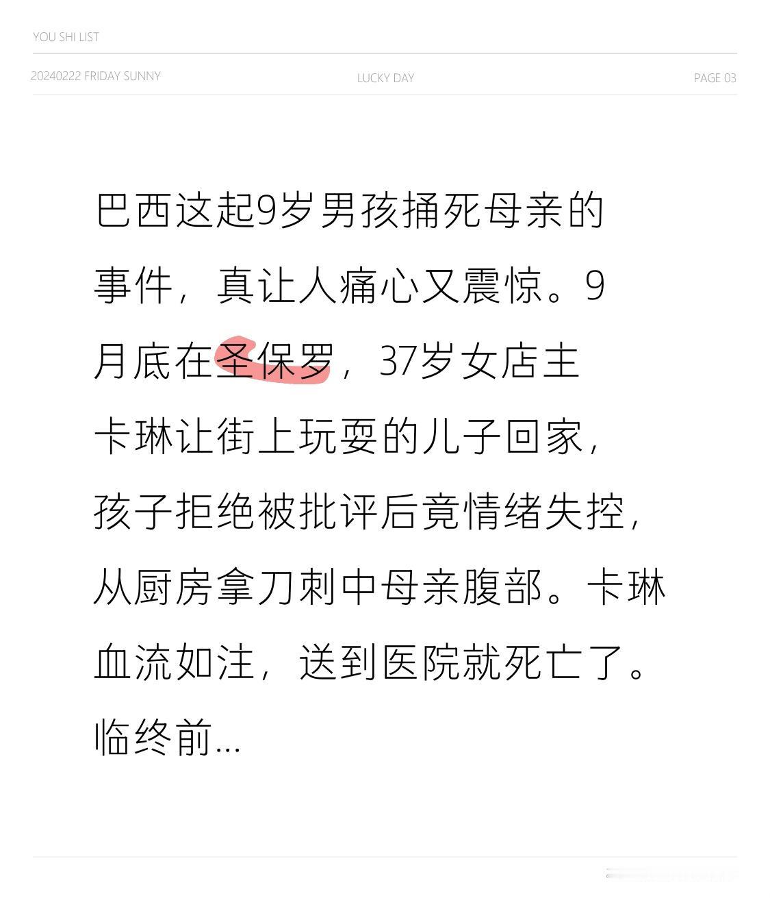 巴西这起9岁男孩捅死母亲的事件,真让人痛心又震惊。9月底在圣保罗,37岁女店主卡琳让街上玩耍的儿子回家,孩子拒绝被批评后竟情绪失控,从厨房拿刀刺中母亲腹部。卡琳血流如注,送到医院就死亡了。临终前她没责怪孩子,只让孩子抱一下,这一幕太虐心。 卡琳19岁大儿子说弟弟平日性格暴躁,受责备就攻击人,常和家人冲突。可按巴西法律,12岁以下儿童不被起诉或拘留,男孩现在由亲戚照顾。这案件后续调查要考察家庭情况和孩子行为背景,只希望这样的悲剧别再发生。