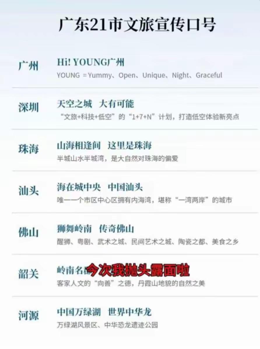 广东各地文旅的宣传口号~ 你觉得哪一个最好,最符合,最有感觉? 一个好的广告语是怎么来的? 按照战略定位的标准看才有结果~ 就是要符合城市的定位,否则就失去了标准, 现在各地的城市定位,也经常变来变去的! 几年一变,也不知道这个城市到底是什么定位!其实城市就是一个品牌,应该有他的战略和鲜明差异化的定位,你觉得呢,你喜欢哪句广告语,可以打几分呢?