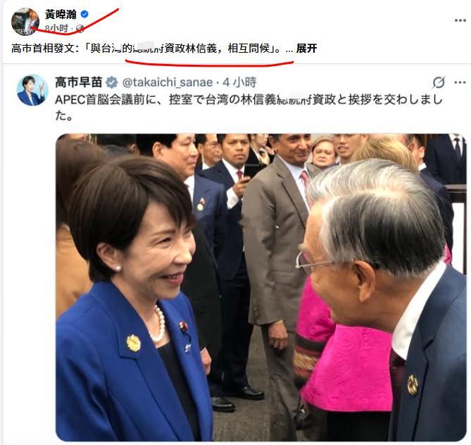 日本政客高市早苗开心于擓了川普大统领的手臂(图2),湾湾政客开心于弯腰跟日本高市早苗握手(图1),内心态度可以感受。