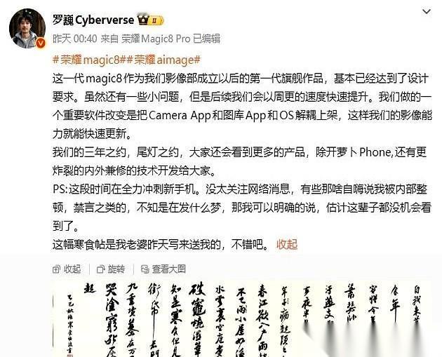 我没看错吧,荣耀影像的大哥,亲自下场说要给 Magic8 “周更”? 手机系统按“周”来优化?这什么概念? 这比我追的网文更新还勤快啊。 说白了,就是大大方方承认:“我们刚交卷,还有点小毛病,但我们不藏着掖着,当着所有人的面,一周一周给你改好。” 这态度,比那些嘴硬说自己产品完美无瑕的,不知道高到哪里去了。真实,比完美重要。 其实吧,这机器底子本来就好得吓人。 那个夜景,啧啧,黑的地方能看清细节,亮的地方不过曝,随手一拍就很有质感,不像有的手机,一到晚上就瞎了。 还有那个AI调色,简直是“懒人福音”。阴天拍的照片,一键给你整出个夕阳大片的感觉。 最绝的是还能“偷”别人照片的色调…… 这不就是明着告诉我,以后朋友圈的好看照片,我都能“复制粘贴”了? 现在人家工程师说了,这还不是它的全部实力。 硬件的潜力,要靠后面的算法一点点给你解锁。 意思就是,你今天买的手机,可能下个月拍照就比今天更牛。 这哪是买了个手机,这是请了个7x24小时待命的影像优化团队啊。 已经上车的朋友,踏实等着吧,每周都有新惊喜。 还在观望的,这定心丸够大了吧? 卷,太卷了。但这种卷,我喜欢。