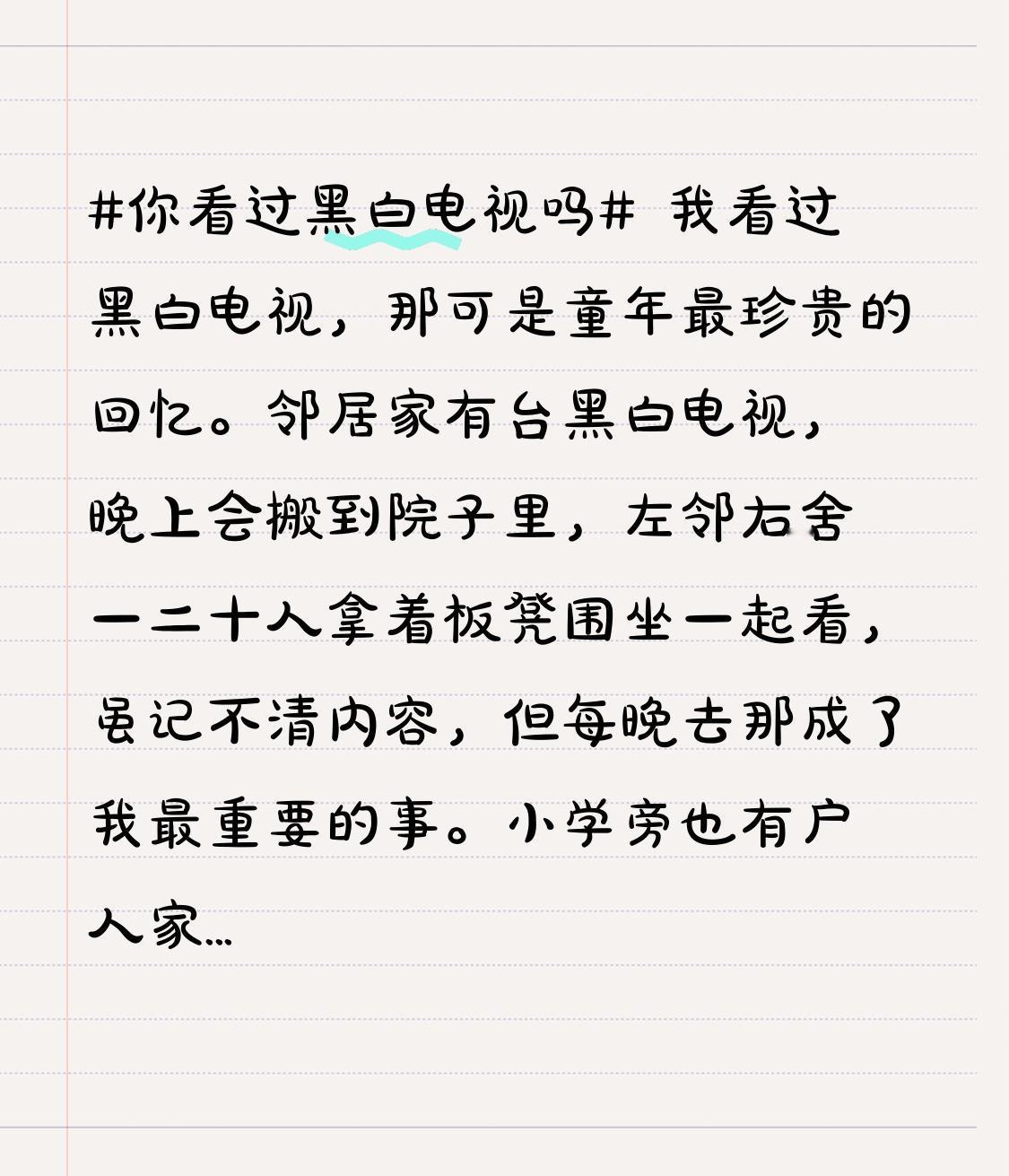 我看过黑白电视,那可是童年最珍贵的回忆。邻居家有台黑白电视,晚上会搬到院子里,左邻右舍一二十人拿着板凳围坐一起看,虽记不清内容,但每晚去那成了我最重要的事。小学旁也有户人家整天开着电视,一下课我们就冲过去看几眼,要是放学就能看完再回家,当时播着《济公》和《西游记》。后来我家也买了,爸爸爱看体育节目。印象最深的是《新闻联播》的图案和《聊斋志异》,开播音乐一响,我就喊姐姐回屋。如今屏幕大了,却难找回当年的专注与期待。
