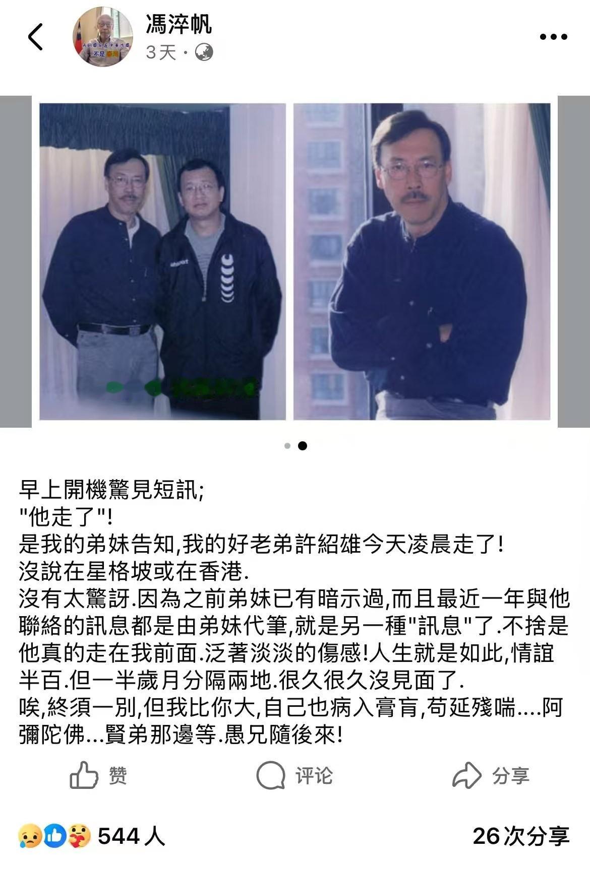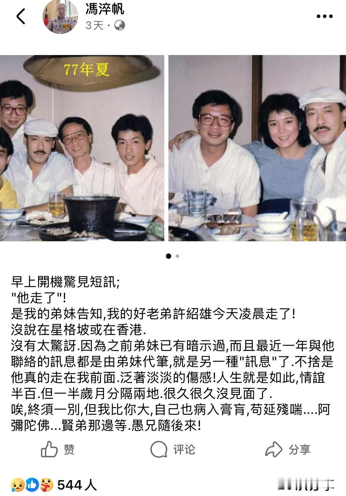 又一位老艺术家离世,3天前还在悼念许绍雄,说“舍不得许绍雄走在他的前面”,还说“贤弟那边等,愚兄随后来”,没想到仅仅隔了3天就走了,真是让人唏嘘不已!  11月1日凌晨,81岁的著名影星冯淬帆突然传来离世的消息,实在是让人惊讶。 虽然大家都知道冯老今年的身体一直不好,但也想不到他会如此突然地离开,毕竟就在几天前,冯老还在网上发文悼念许绍雄,他称对方为老弟,并直言不舍许绍雄先他而去。 根据冯淬帆在网上发的帖子,许绍雄早在一年前身体就出了问题,因为冯老多次联系许绍雄,都是由许的妻子代笔,这正是一种暗示。 而冯淬帆自己,也是深陷疾病折磨,今年5月曾住院治疗,并且一住就是两个多月,在悼念许绍雄的时候,他还自嘲“病入膏肓,苟延残喘”,让许绍雄等他,没想到真是一语成谶,只过了3天就应验了。 冯淬帆在港台影视圈混迹几十年,拍过许多脍炙人口的作品,其中更以代表作《最佳损友》而闻名。 老艺术家们一个接一个地离世,让人感觉到时代的快速流逝,然而这就是自然规律,是谁也无法抗拒的。 祝冯淬帆老先生一路走好,也希望他在泉下能与老弟许绍雄很快相遇吧!