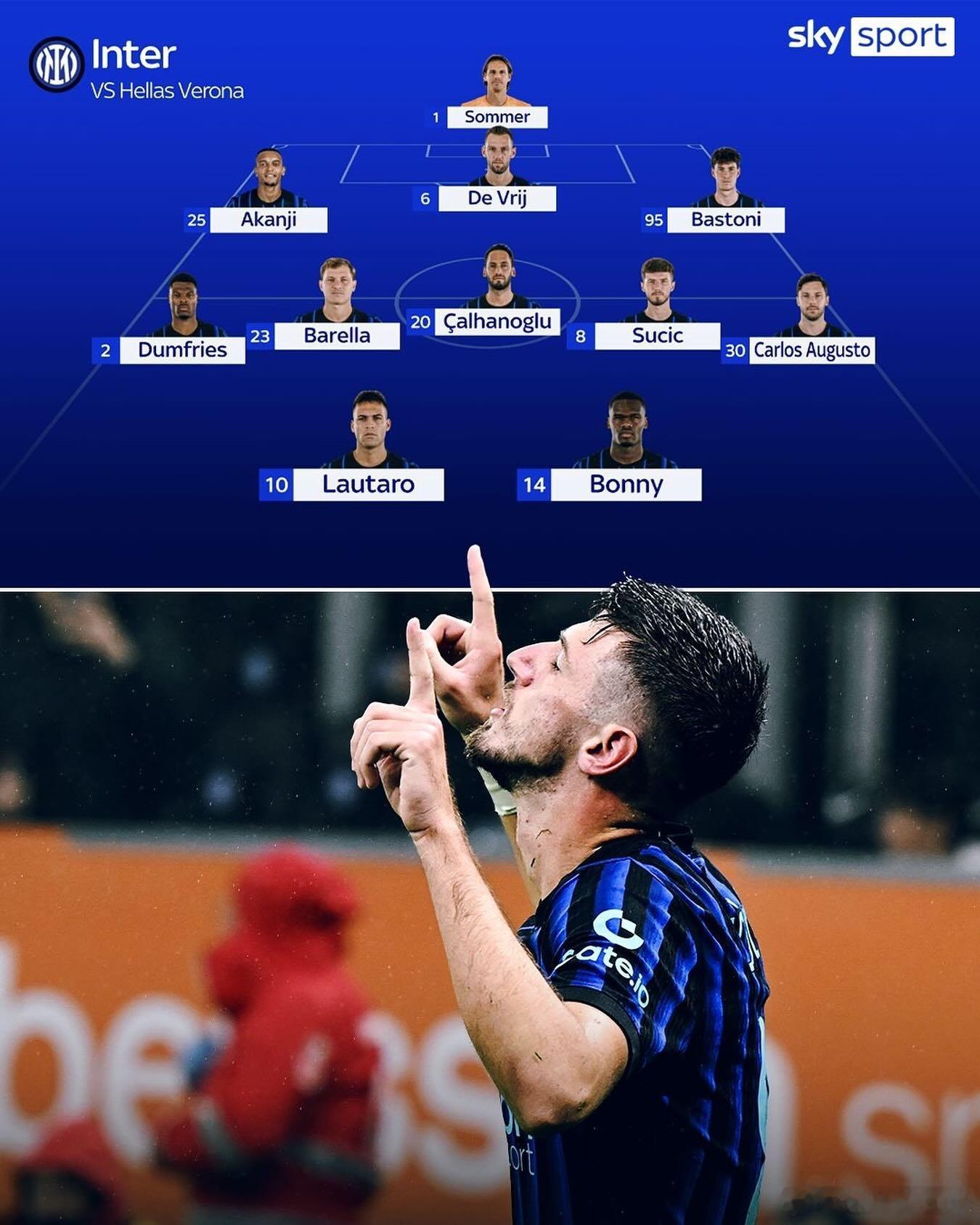 【SKY】国际米兰本轮对阵克雷莫内塞的首发阵容,博尼、奥古斯托首发出场。💙🖤