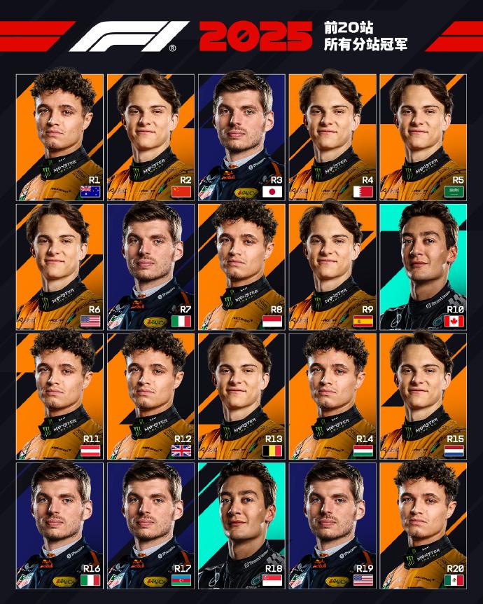 赛车:2025F1前20站冠军一览 皮亚斯特里:🏆🏆🏆🏆🏆🏆🏆 诺里斯:🏆🏆🏆🏆🏆🏆 维斯塔潘:🏆🏆🏆🏆🏆 拉塞尔:🏆🏆