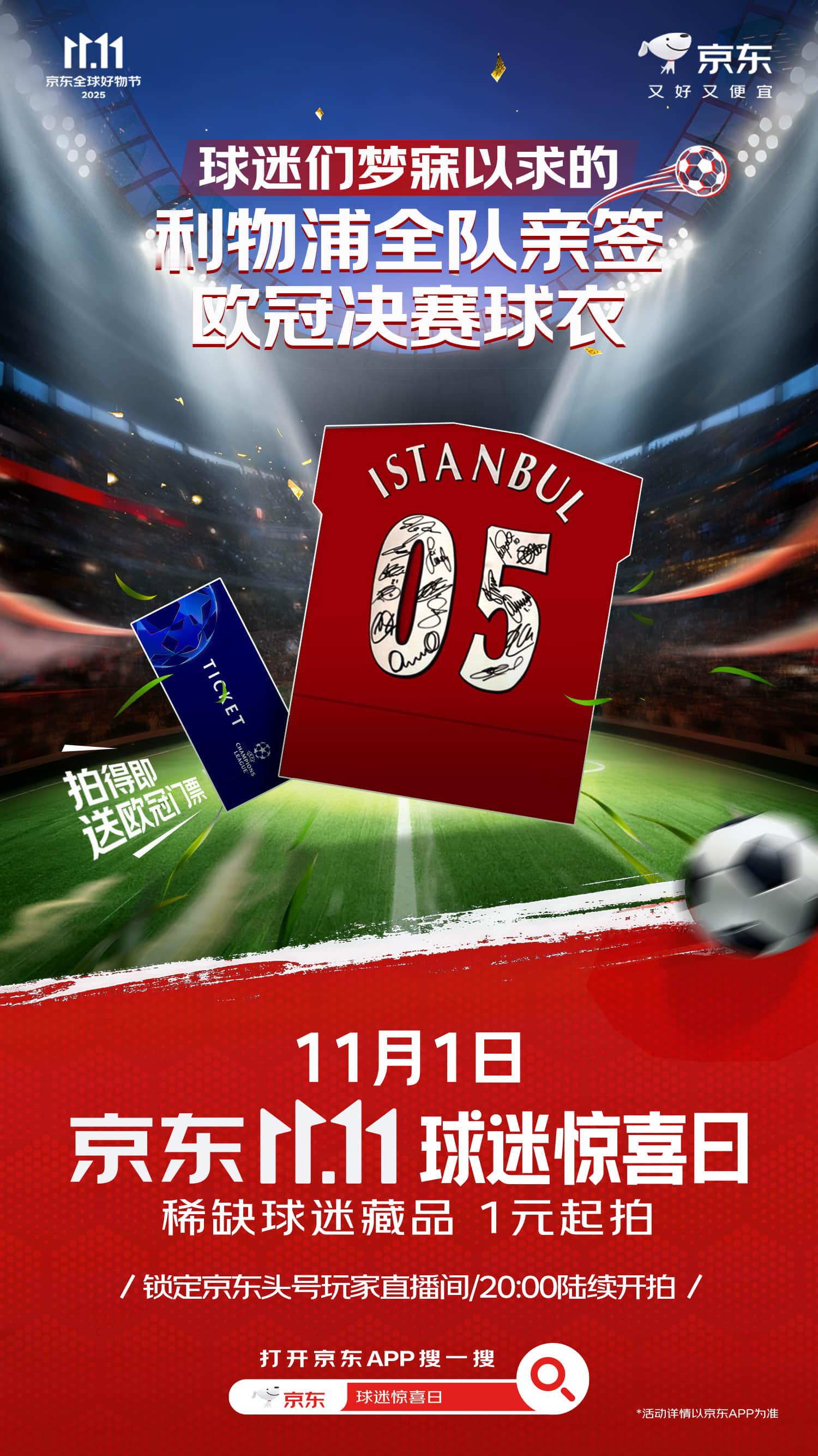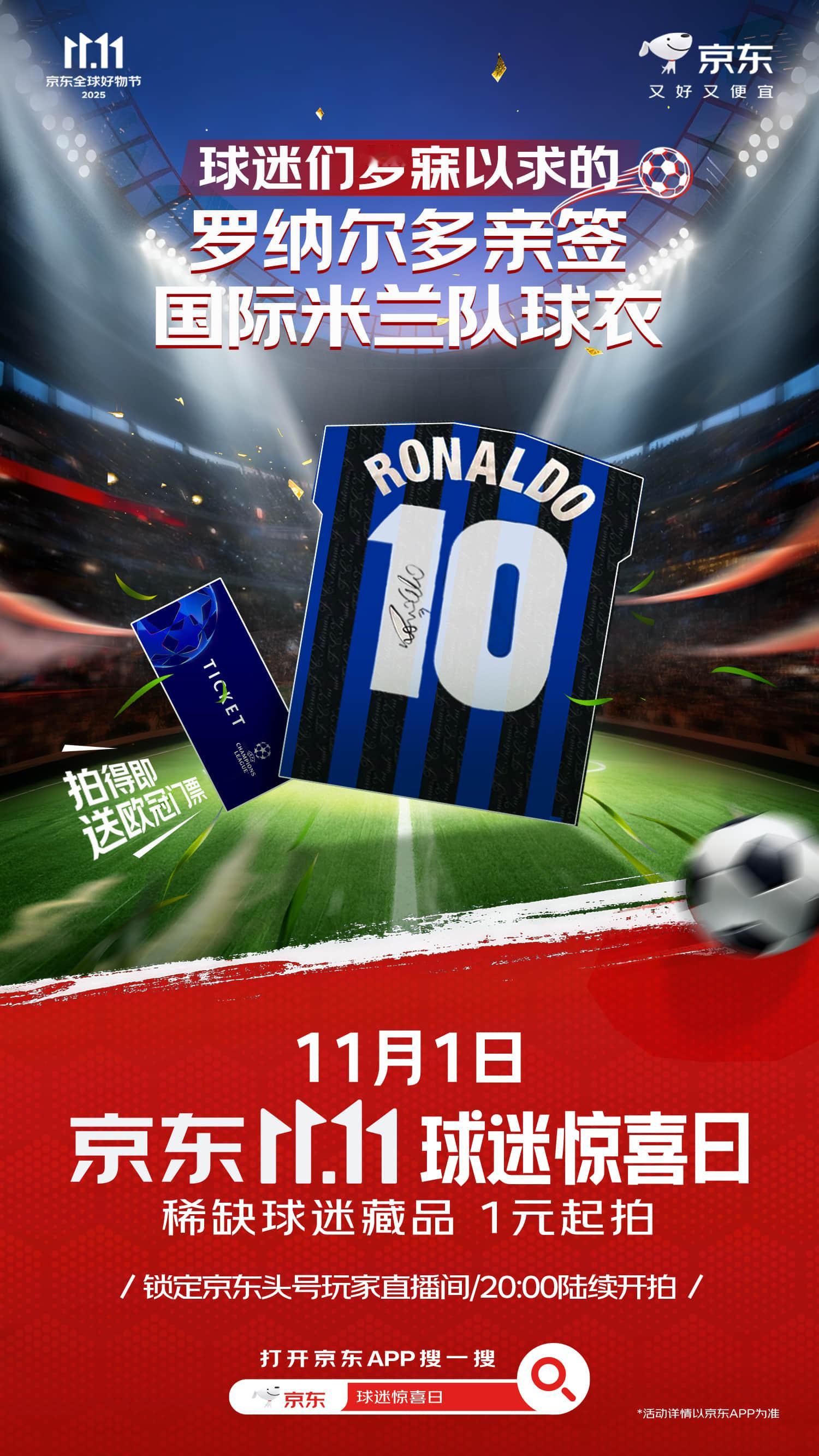 从营销角度看,京东这波球迷惊喜日堪称教科书级别!精准洞察球迷需求,C罗、库里、国乒队……各种顶级球星的稀缺球迷藏品1元起拍,福利给到位,传播声量直接拉满。11月1日 京东11.11球迷惊喜日,球迷好物1折起。来京东看苏超决赛猜胜负,押中抽宇树机器人、百吋电视、超市好物;球迷稀缺亲签周边1元起拍;武艺空降直播,陪看“苏超”决赛送福利。梅西C罗签名球衣京东拍卖 来京东球迷惊喜日看苏超决赛猜输赢 京东11.11 又好又便宜