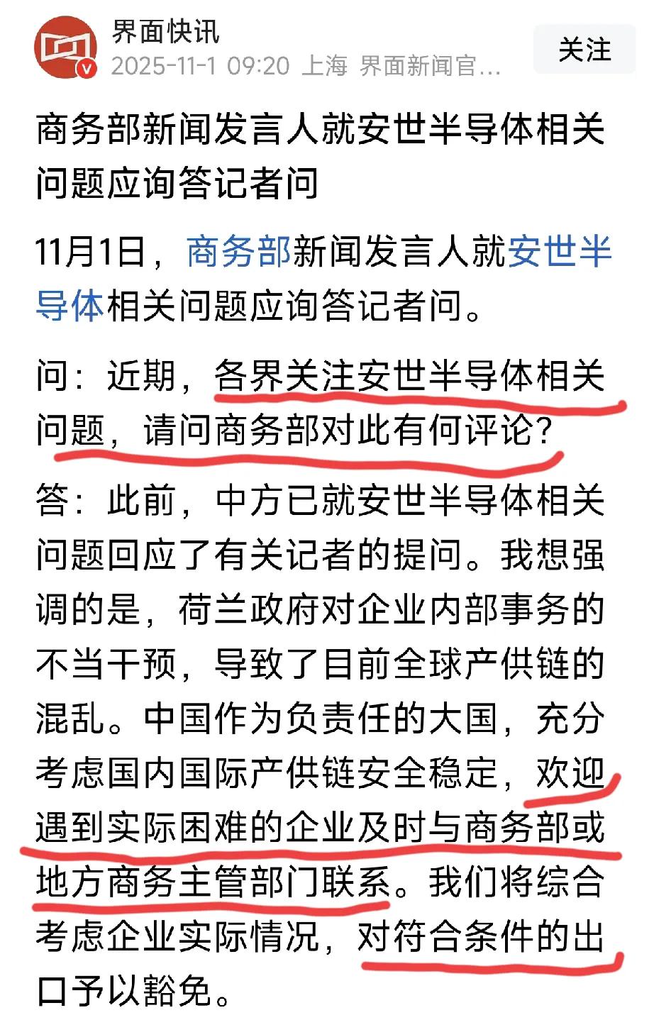 这年头,半导体界的风波简直比宫斗剧还精彩——荷兰政府冷不丁插手安世半导体,愣是把全球产业链搅成了一锅粥,结果中国商务部反手一记“豁免牌”,妥妥的“四两拨千斤”,让紧张局势瞬间多了几分幽默反转! 荷兰政府强行接管安世半导体的风波持续一个月后,中国商务部于11月1日作出重磅回应,宣布将对符合条件的出口予以豁免。这一表态可不是随便拍拍脑袋的决定,而是中方基于维护全球产供链安全稳定的深思熟虑。商务部新闻发言人应询时指出,荷兰政府对企业内部事务的不当干预已导致全球产供链陷入混乱,中方本着务实负责的态度,欢迎遇到实际困难的企业及时联系商务部或地方商务主管部门,符合条件的出口将获得豁免。这不,中方一边稳住阵脚,一边还给供应链开了条“绿色通道”,简直是“雨中送伞——来得正是时候”! 作为安世半导体的母公司,闻泰科技早前就亮明了立场,强烈抗议荷兰政府以国家安全为借口的歧视性待遇。闻泰科技指出,荷兰政府的干预不仅违背了欧盟倡导的市场经济和公平竞争原则,还让个别外籍管理层钻了空子,试图通过法律程序颠覆公司合法治理结构,这操作简直像“掩耳盗铃——自欺欺人”。公司已启动一切法律与外交途径,要求荷兰政府立即撤销错误指令,并在10月29日再次向荷兰媒体发声,强调只有归还控制权,荷兰才能开始修复其受损的声誉。 回顾事件背景,这场风波始于9月30日,荷兰经济事务与气候政策部对安世半导体实施全球运营冻结,要求其一年内未经许可不得采取决定性行动。中方随后于10月4日对安世中国实施出口管制作为反制,而中美商务部长在10月21日的通话中,中方也敦促荷方维护全球产供链稳定。整出戏演到现在,商务部的豁免表态可谓“神来之笔”,既坚守了原则,又用灵活手腕化解了僵局,让全球产业链不至于“竹篮打水一场空”。 总之,中方的这一举措不仅彰显了维护全球产业链稳定的大国担当,还给国际社会上了一课:在复杂局势中,务实比对抗更管用。正如闻泰科技所言,荷兰若想挽回颜面,还得从“归还控制权”开始! 信息来源:人民财讯、央视新闻、证券时报等权威媒体。安世半导体公司 荷兰芯片战略 荷兰芯片困局 荷兰安世半导体 半导体材料出口 全球半导体行业 荷兰芯片谈判