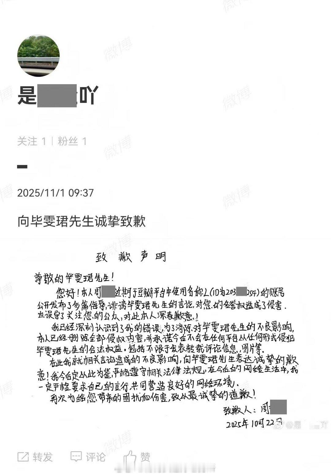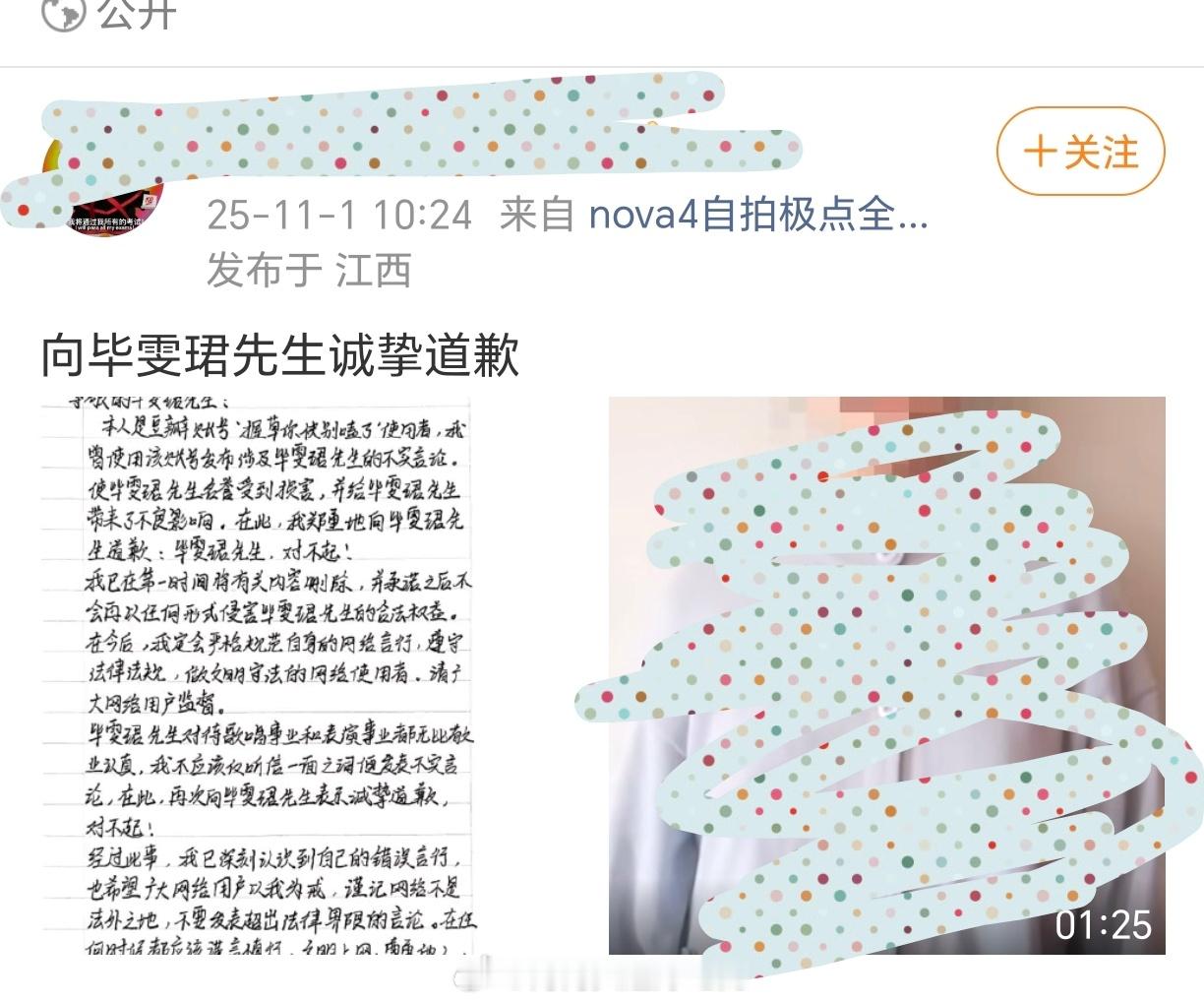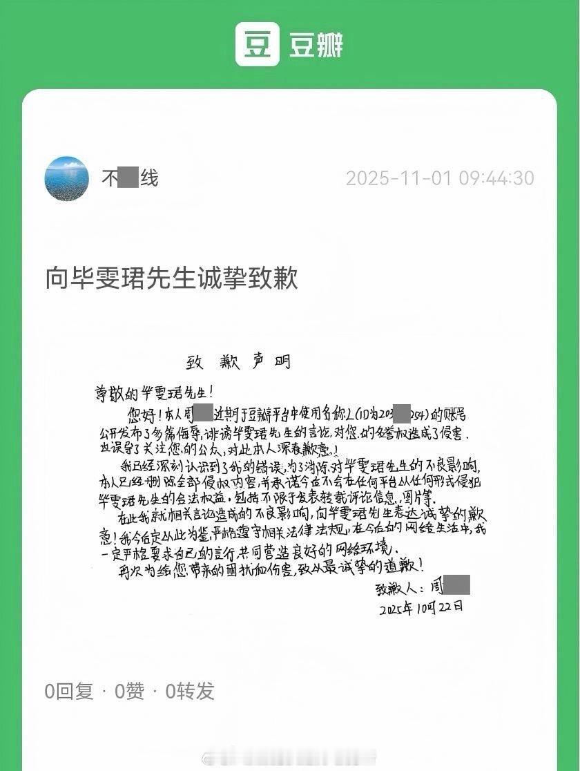 毕雯珺告黑胜诉,那些躲在豆瓣给毕雯珺造h谣的人全部被告后手写道歉信且承担法律责任。