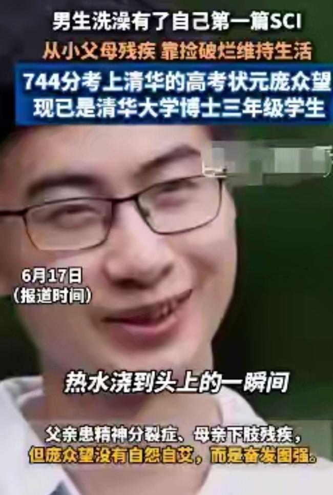 “寒门难出贵子”?庞众望偏要打破这个偏见!被人民日报点名仅两个月,这位从苦难里走出来的清华博士再传喜讯,拿下北京市敬老爱老助老表彰,全网都在为他欢呼。 谁能想到这个如今在清华发光发热、科研成果亮眼的青年,曾扛起整个家。父母无法自理,他从小照顾家人,却凭着一股韧劲儿考进清华,本科后继续攻读博士,甚至洗澡时灵光一闪就搞定科研难题,写出首篇SCI。他从不说自己的苦,反而用经历鼓励新生,用行动诠释孝心与担当。 庞众望的故事从不是“逆袭爽文”,而是告诉我们:命运给的烂牌,靠自己也能打出彩。出身从不是上限,努力和责任才是托举人生的底气。 你被庞众望的哪一点打动了?来评论区聊聊你的看法!