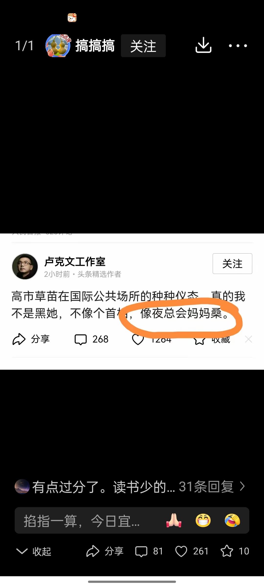 大网红就这么个素质? 卢X文一直以写热点来博眼球,这次小日子首位女领导高市当选,他竟然说人家像妈妈桑,实在是太没有素质了! 作为一个大网红,这么评价外国政要,不合适吧?我们可以批评她的政策多么差劲,她的言行多么不得体,这都无可厚非。但是像个泼妇一样骂大街,真是个没品的人! 其实我也知道卢某吃的跟战狼一样的那碗饭,自从他狂吹遥遥领先以后,我就拉黑了他。因为我认为这种人,为了流量,跟张伪伪、金嘿嘿、司马北一样,根本没有底线!