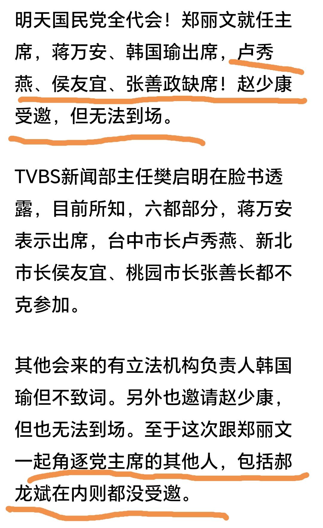 郑丽文正式接任国民党主席。内部分裂公开化。侯友宜、卢秀燕、赵少康不去意料之中,张善政有点意外。 国民党内这批人还是很有能量,郑丽文虽然当上了首领,但日后被拆台的事情不会少,日子并不好过。 顺便说一句,台湾光复80周年,国民党没有主办大型纪念活动,然后我们在卢秀燕主政的台中市看到这样一幕。图四。蒋万安主政的台北市在搞同性恋大游行。 这就是国民党。 郑丽文的路不好走。不过也没关系,反正也走不了多久。 点右上角关注我,我们一起去看这个魔幻的世界