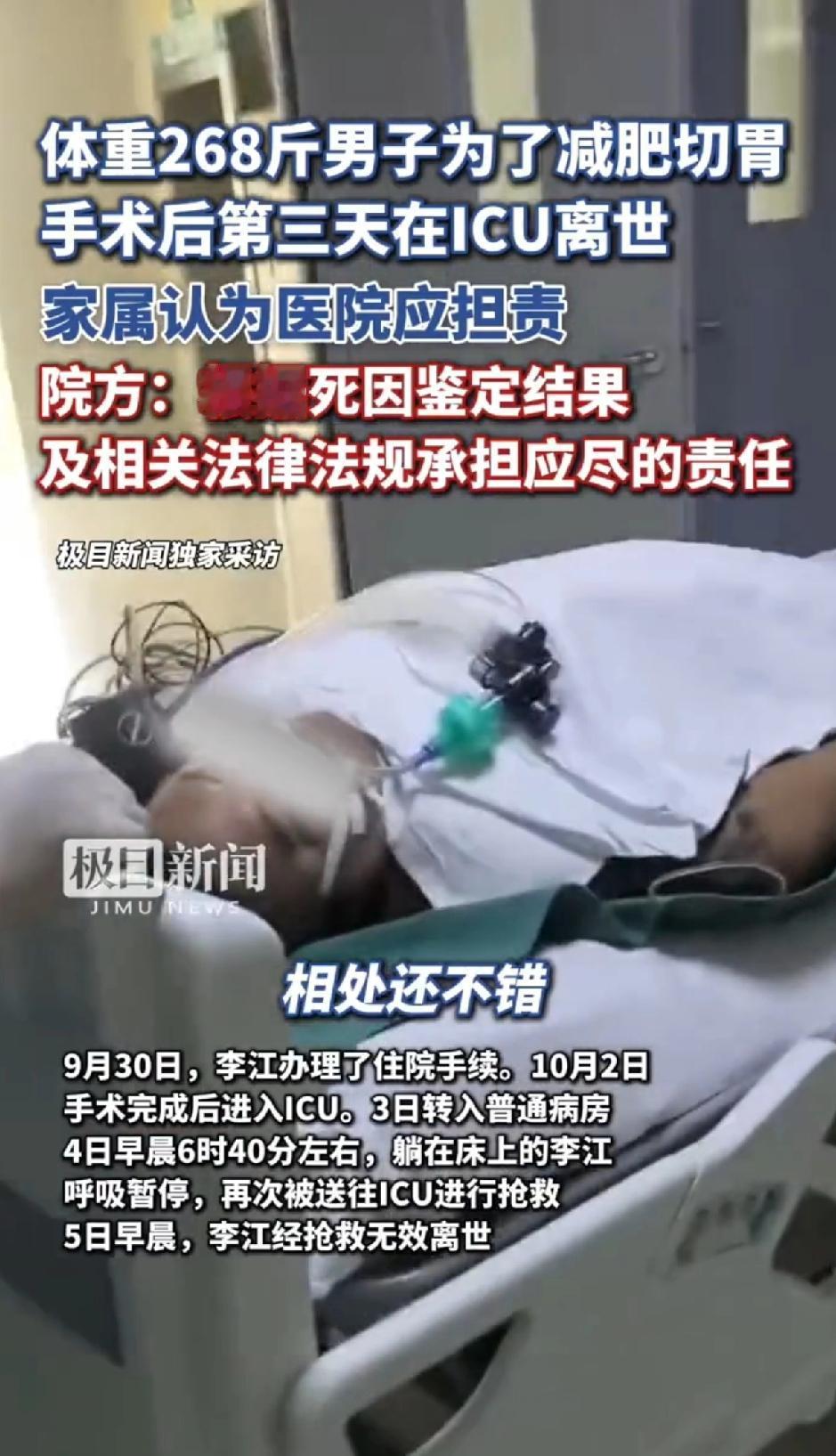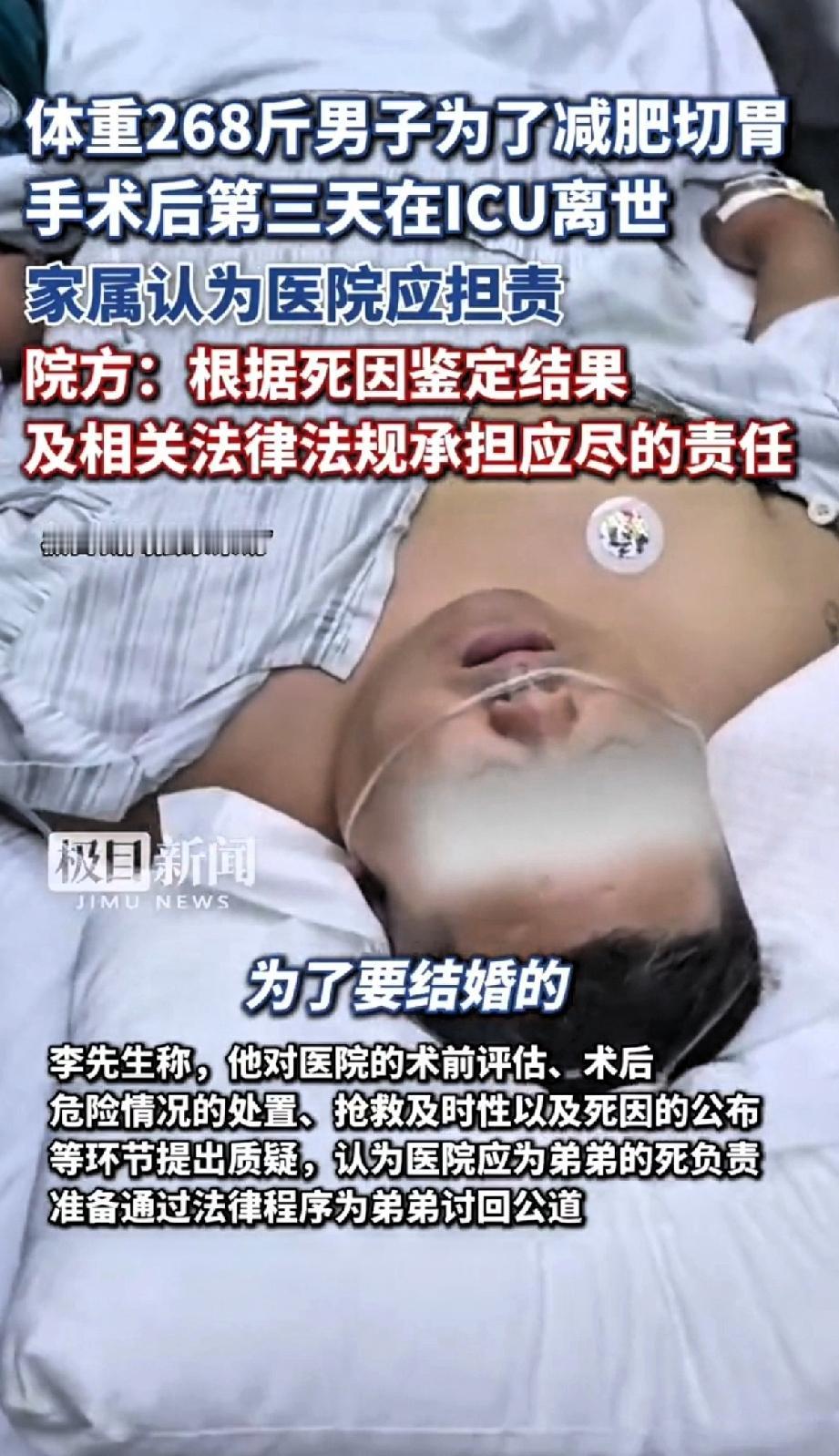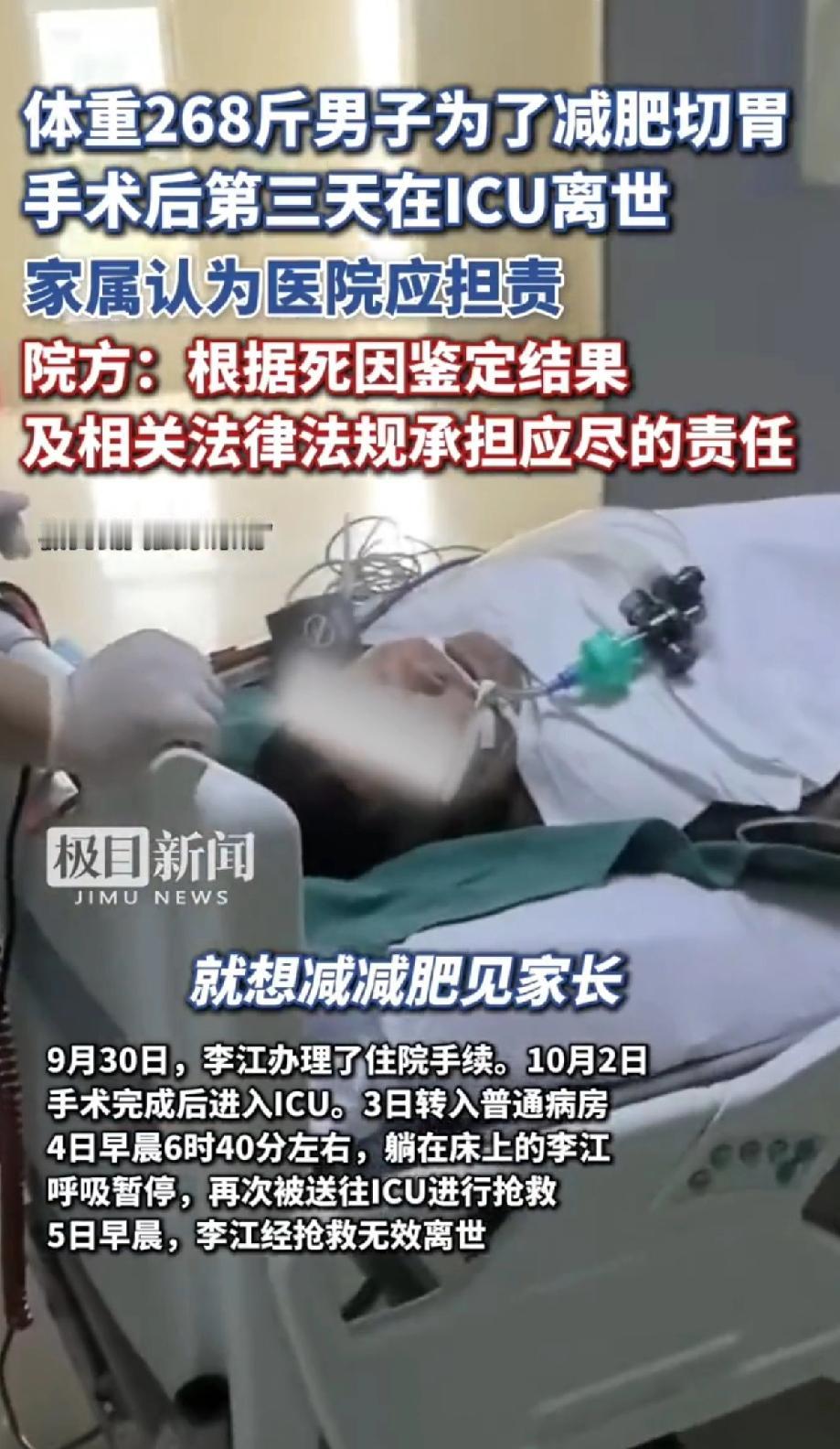 体重268斤男子为了减肥切胃手术后第三天在 ICU 离世,家属认为医院应担责。 院方:根据死因鉴定结果 及相关法律法规承担应尽的责任 男子亲属:他268斤体重据李先生讲述,弟弟李江(化名)36岁一直想减肥但控制不了饮食,找了个对象相处还不错,计划见对方家长。 为了把形象弄好一些,给女方家长一个好印象,选择在医院做切胃手术,结果不幸离世。 这真是太可怜了,婚没结成还把命搭进去了。 七星山野外生存挑战赛,适合想减肥,又减不掉的肥胖病人! 如果侥幸赢了还能拿奖金,又能减肥!对于肥胖的人来说无论输赢,都是利大于弊。 看看挑战的选手们哪一个不瘦,都是几十斤的肉往下掉。 花钱做切胃手术还是有很大风险的! 看视频里的男子,虽然有点胖,但还不至于要到做手术的地步。 这种手术做的丢了性命真是得不偿失。