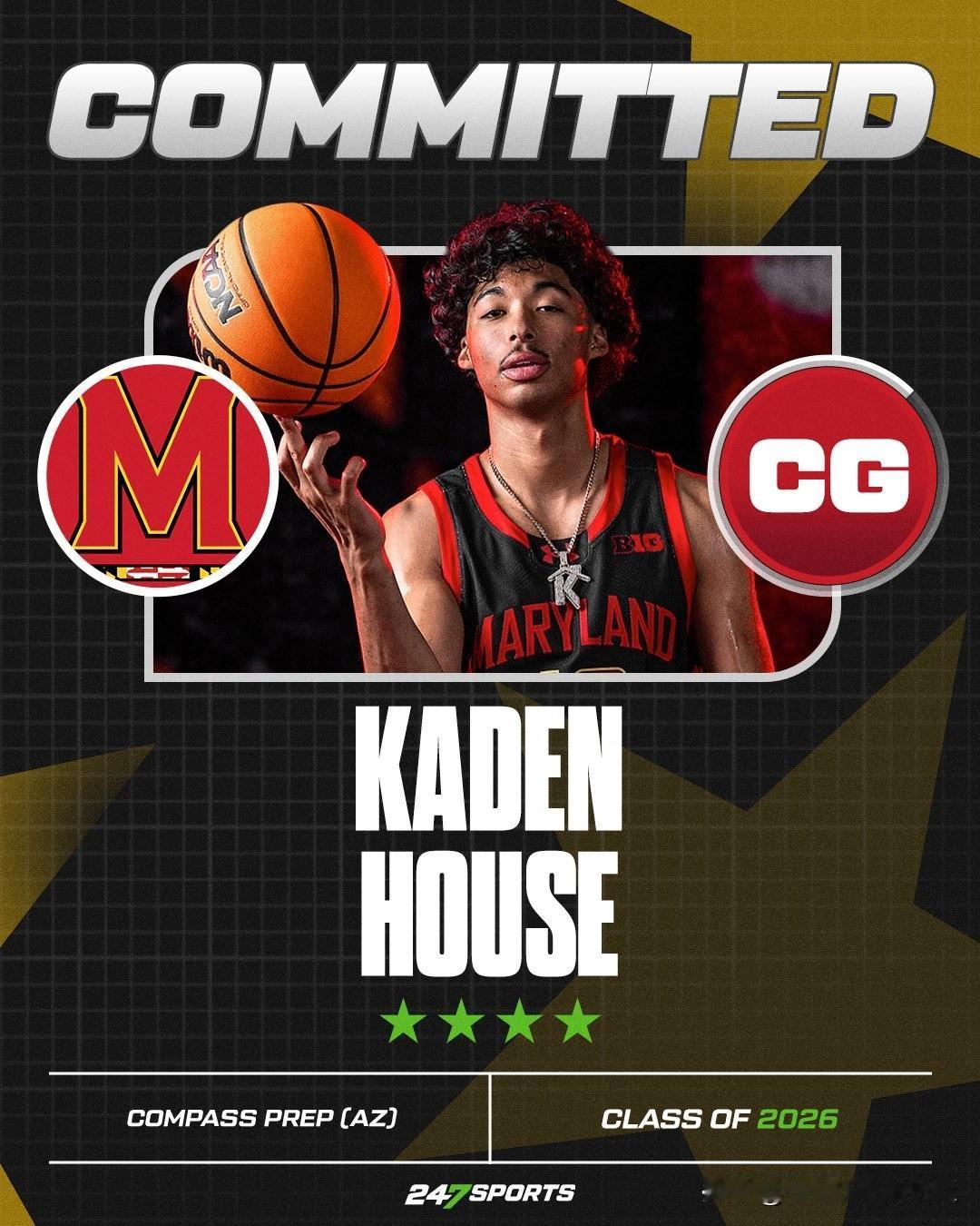 TOP40四星后卫Kaden House宣布承诺NCAA男篮 马里兰大学,来自菲尼克斯,身高6-3=191,高四赛季就读于亚利桑那州AZ Compass Prep,父亲埃迪-豪斯曾在家乡球队亚利桑那州立打球,他表示选择这里主要是因为我和教练组的关系,觉得他们可以帮助我实现目标,让我成为最好的自己。