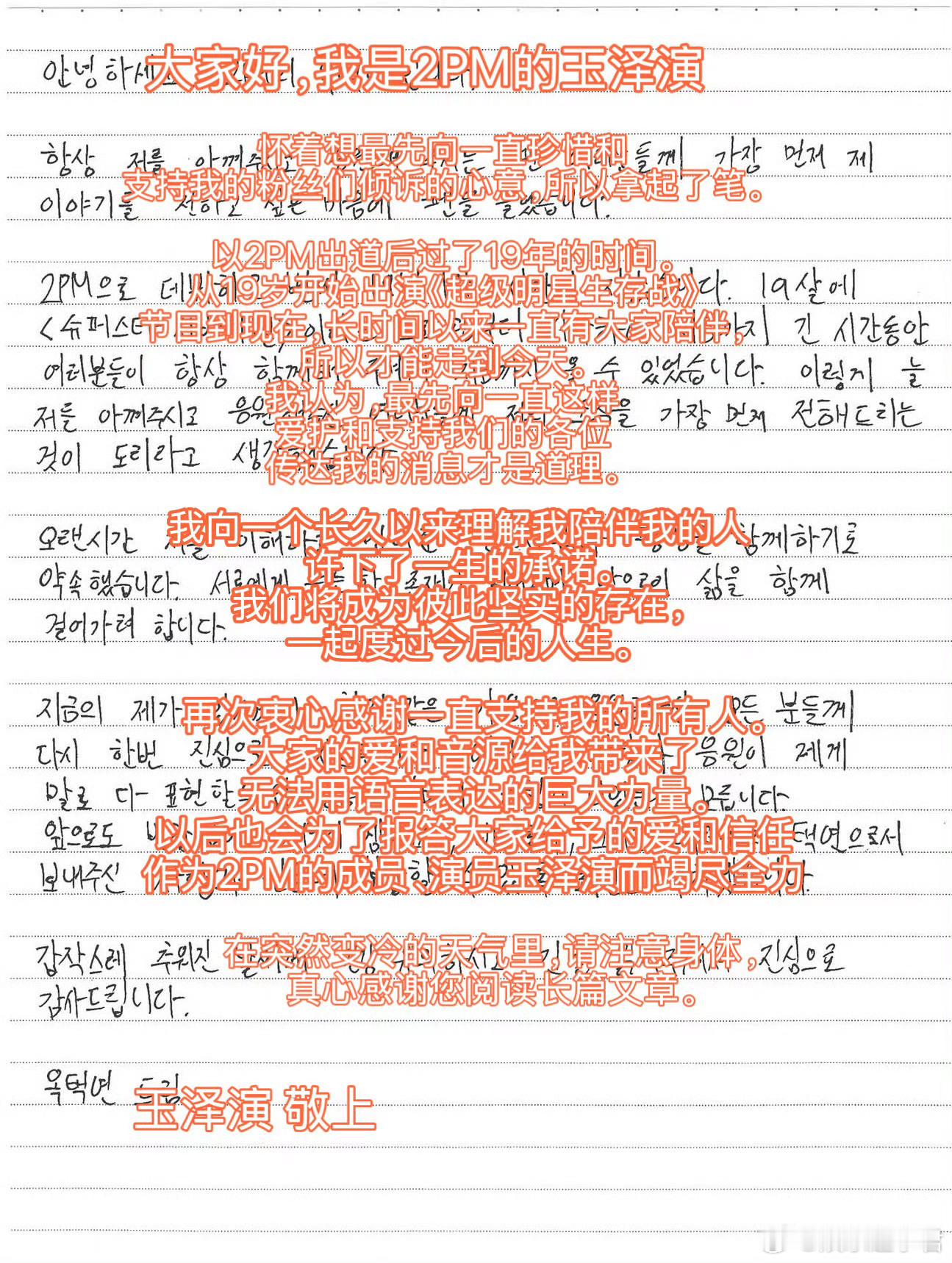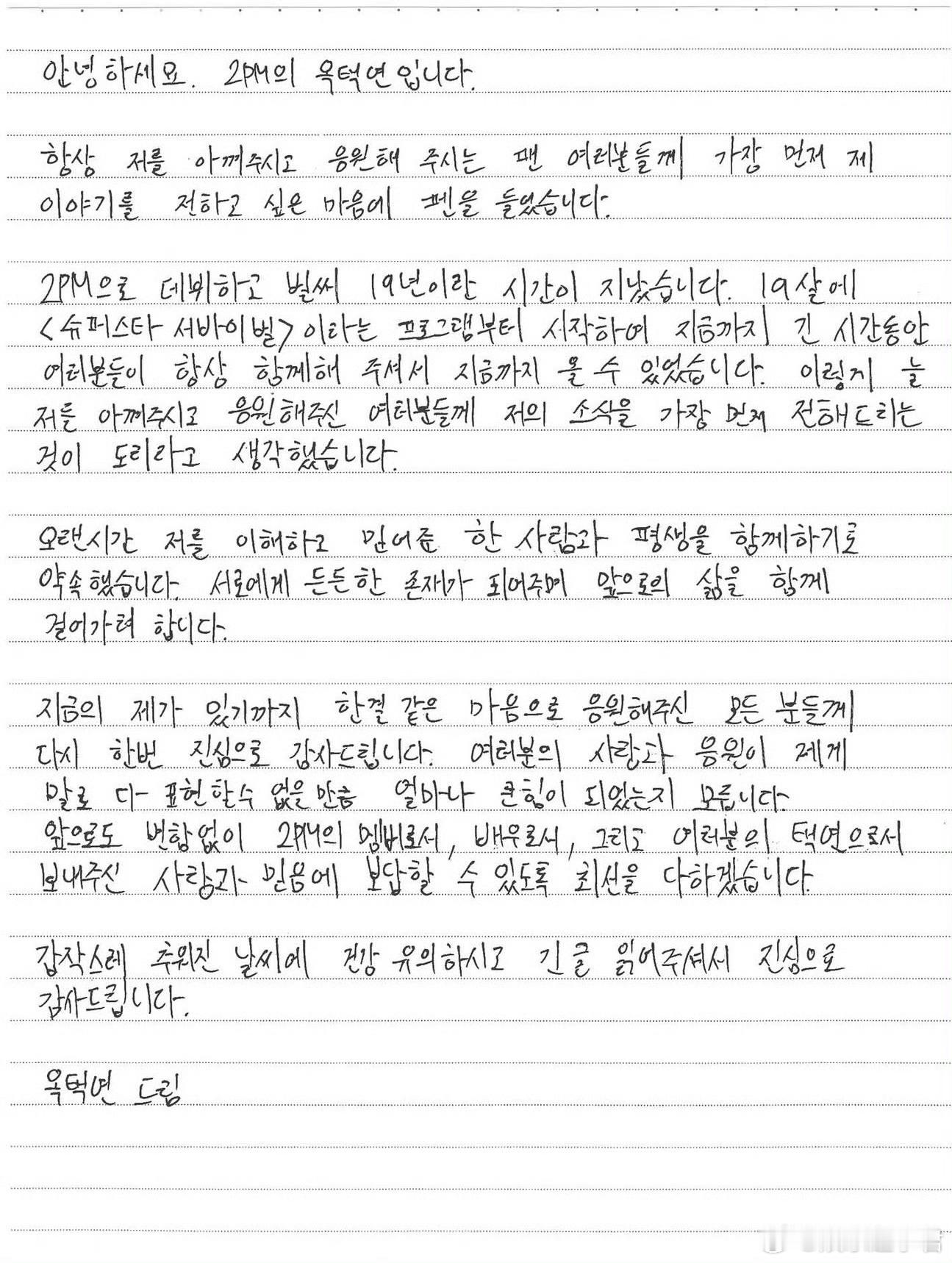 玉泽演晒手写信宣布结婚玉泽演ins发布手写信宣布结婚,“我向一个长久以来理解我陪伴我的人,许下了一生的承诺。”经纪公司回应表示明年春天邀请亲朋好友在首尔举行婚礼,新娘是素人所以详细的内容非公开,结婚之后也会进行活动。