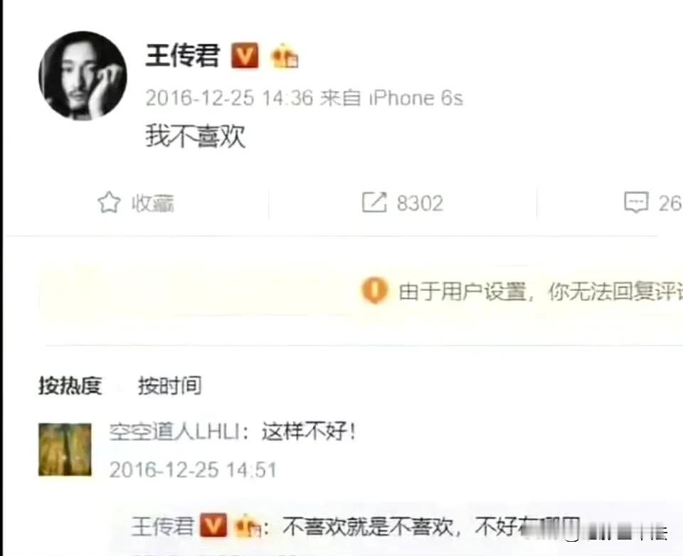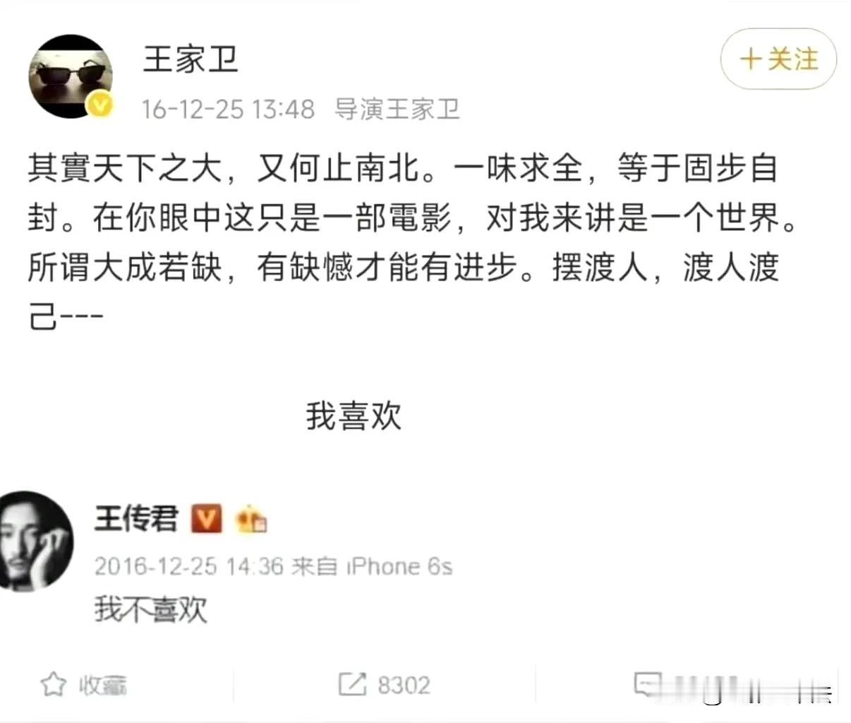 王传君说,不要太相信别人的话,尤其是成功人士的话,因为别人和你说的不一定都是真话,只有自己脚踏实地一步一步去干,你才能知道自己到底能走到什么地方,别人的话只是别人的,不是你自己的。 难怪当年只有他一个人敢于对王家卫说“我不喜欢”,就是因为他有自己的想法,他尊重前辈,但不会认为前辈说的都是对的,他会根据自己的意愿去摸索最适合自己的路,他尊重前辈的成功经验,但不会盲从。 但是也别过度吹捧王传君,因为你如果欣赏王传君,又认可他的话,在他眼里你就是盲从成功人士,所以对任何成功人士的话都要保持谨慎,尤其是娱乐圈明星,因为他们最会演,谁能保证王传君说的就是他真实想法? 另外有个猜想,当初王传君众人皆醉我独醒的时候,批评他的那群人,大概率和现在吹捧他清醒的是同一批人,这群人就是墙头草,随风倒。 而且其实,从言论看,王家卫比王传君真实多了,因为相信王家卫说的就是他真实想法,王传君说的就是自己真实想法吗,未必。