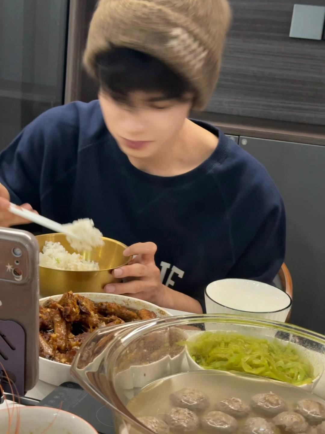 看把孩子饿成啥了,不过哲远啊,那个油也不会吃你,怎么张牙舞爪的嘞~一口大米饭给