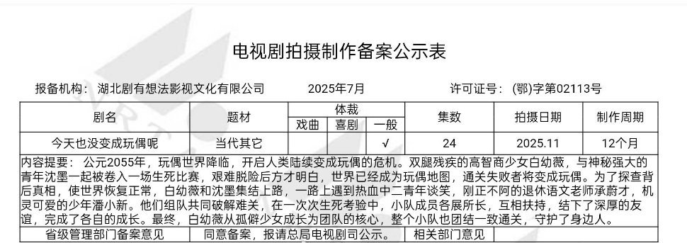 《今天也没有变成玩偶呢》主演🈶陈都灵、陈靖可,导演章笛沙,暂定2月开机