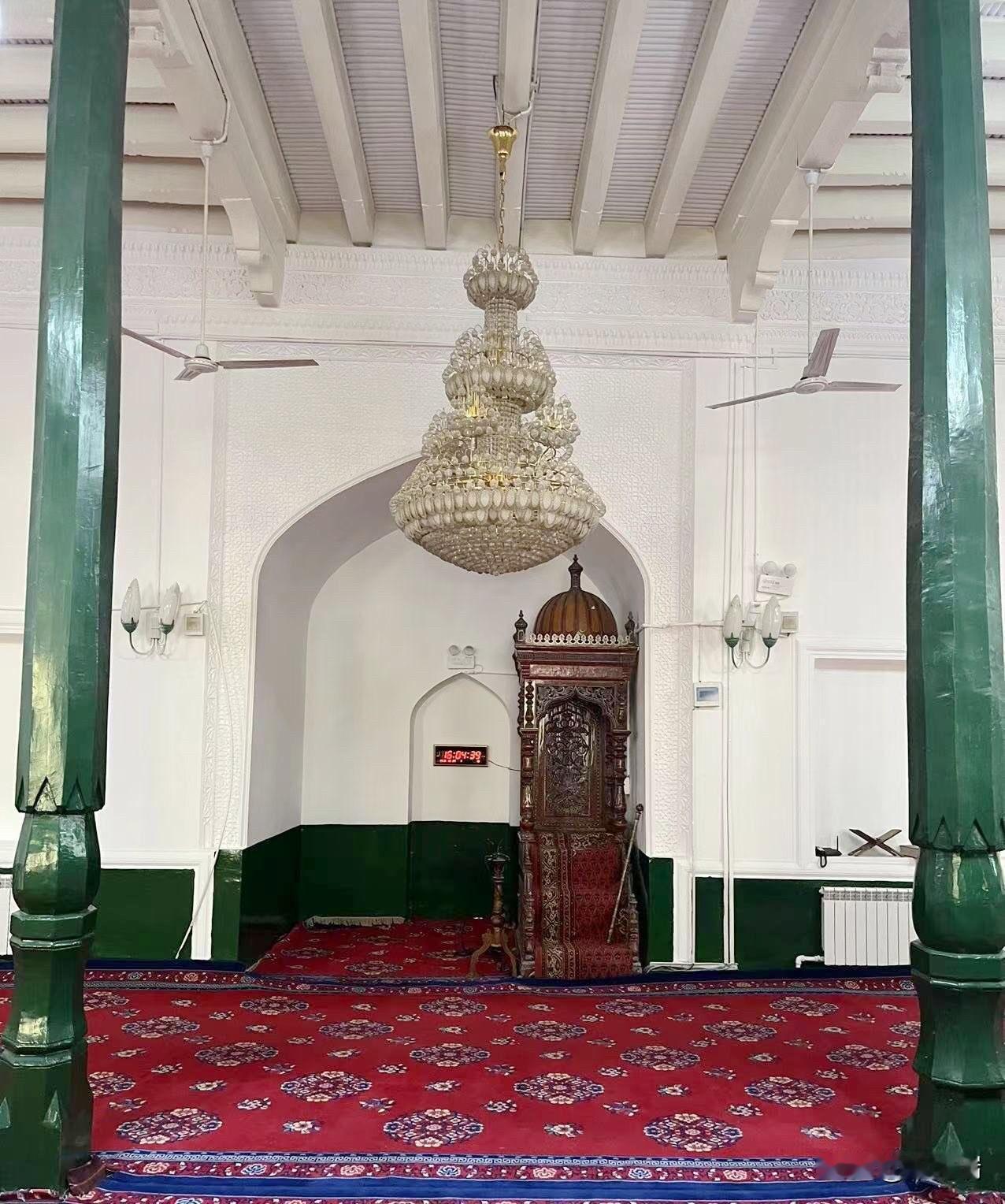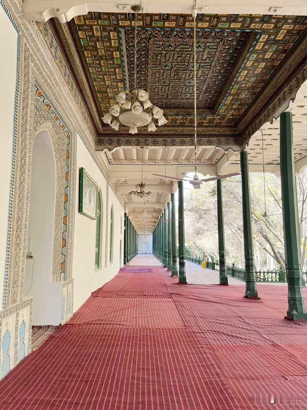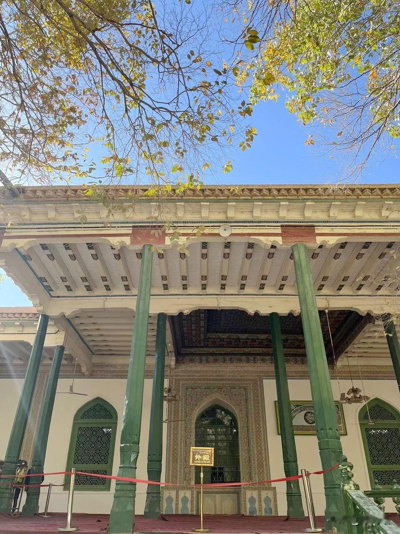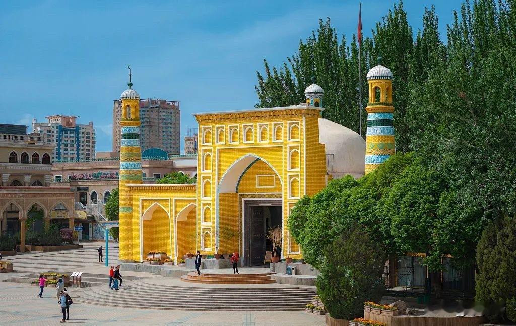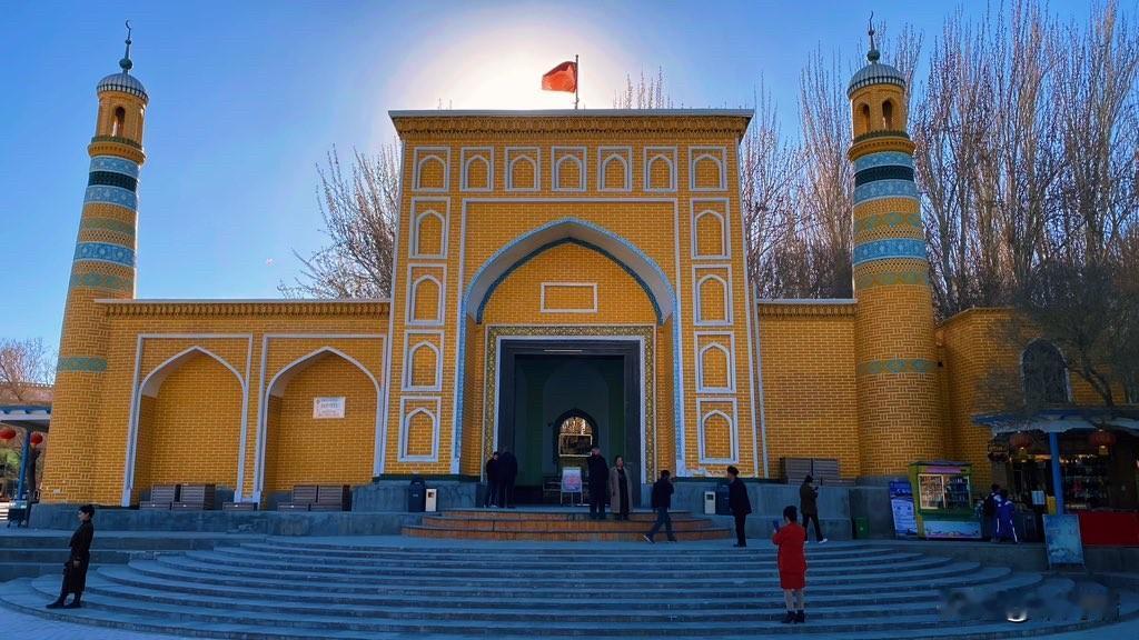 艾提尕尔清真寺是新疆乃至中国规模最大的清真寺之一,位于新疆维吾尔自治区喀什市中心。寺院始建于1442年,占地面积达1.68万平方米,具有深厚的历史文化底蕴和独特的建筑风格。 艾提尕尔清真寺最早可追溯到1442年,由当时的统治者沙克色尔·米尔扎为纪念其叔父而修建。 在随后的几个世纪中,寺院经过历代统治者的不断扩建和修缮,最终形成了如今的规模。它在古代曾是传播伊斯兰文化和培养人才的重要学府。 清真寺坐西朝东,占地1.68万平方米,主要由门楼、庭院、礼拜殿、教经堂、宣礼塔等部分组成。 门楼:高大的寺门两侧耸立着两座18米高的宣礼塔,与门楼和短墙构成和谐的整体,是典型的中亚建筑风格与维吾尔族民族色彩的融合。 庭院:进入寺门后是巨大的拱拜孜(圆顶),拱拜孜下方是多边形过庭。庭院内绿树成荫,有两个水池,环境清幽。 礼拜殿:礼拜殿是清真寺的主体建筑,面积达2600平方米,可同时容纳4000人进行礼拜。 教经堂:庭院南北两侧是教经堂,共有24间房屋。