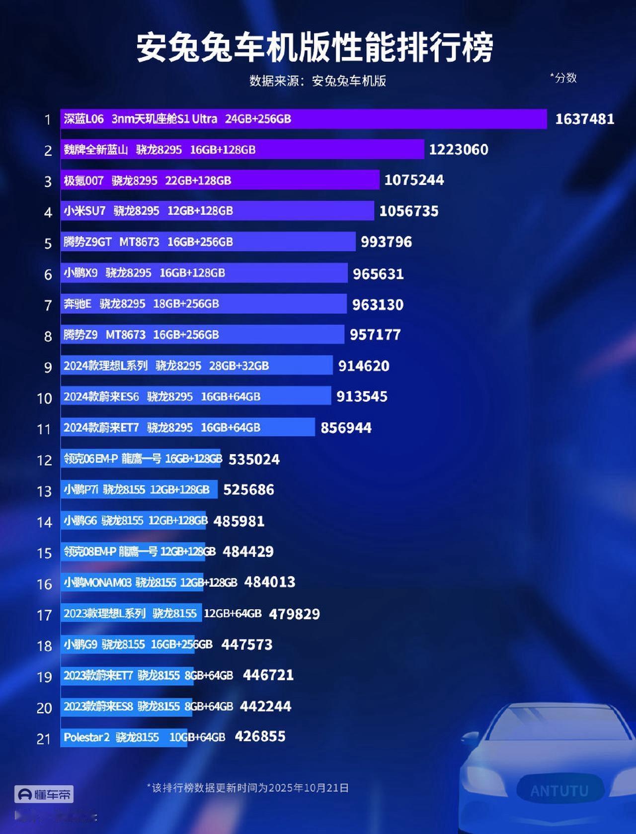 深蓝的性能跑分有点夸张啊,现在深蓝的车机分数荣登安兔兔第一名,凭借1637481的分数暂列排名榜单的第一名☝️ 长城汽车看过来,是不是该紧张了,这比分直接比第二名发出去了一大截,真的难以想象深蓝有什么厉害的架构吗?