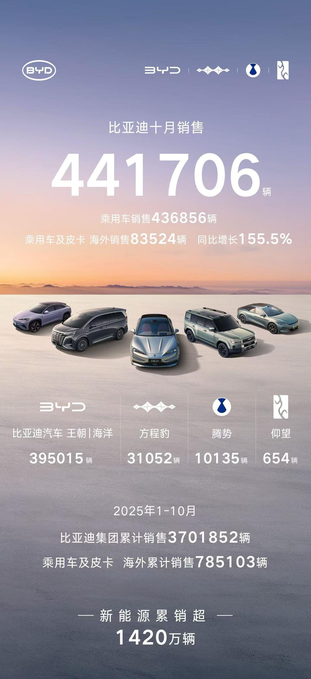 比亚迪10月销售441706辆,1-10月累计销售3701852辆,再卖8918
