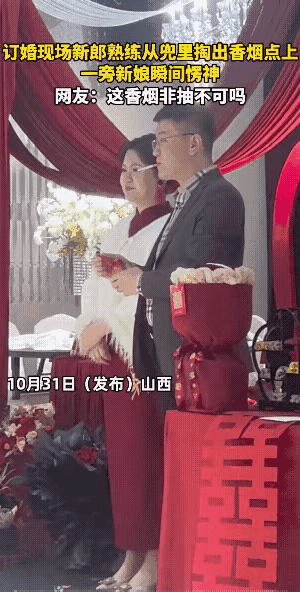 这个小伙子在订婚的现场上,很随意的就吸起烟来,这只能说明以下几个问题:第一,说明这个小伙子的烟瘾很大,想吸烟的时候,不吸真有点受不了。第二,说明这个小伙子很自信,很有优越感,换句话说,说明小伙子对其他人的感受并不在意,这里面也包括自己的未婚妻和她的家人。第三,说明小伙子对有些礼数看的很淡,什么场合不场合的,没拿这些当一回事。个人觉得,如果这小伙子发展好的话,能成就一番大事业!
