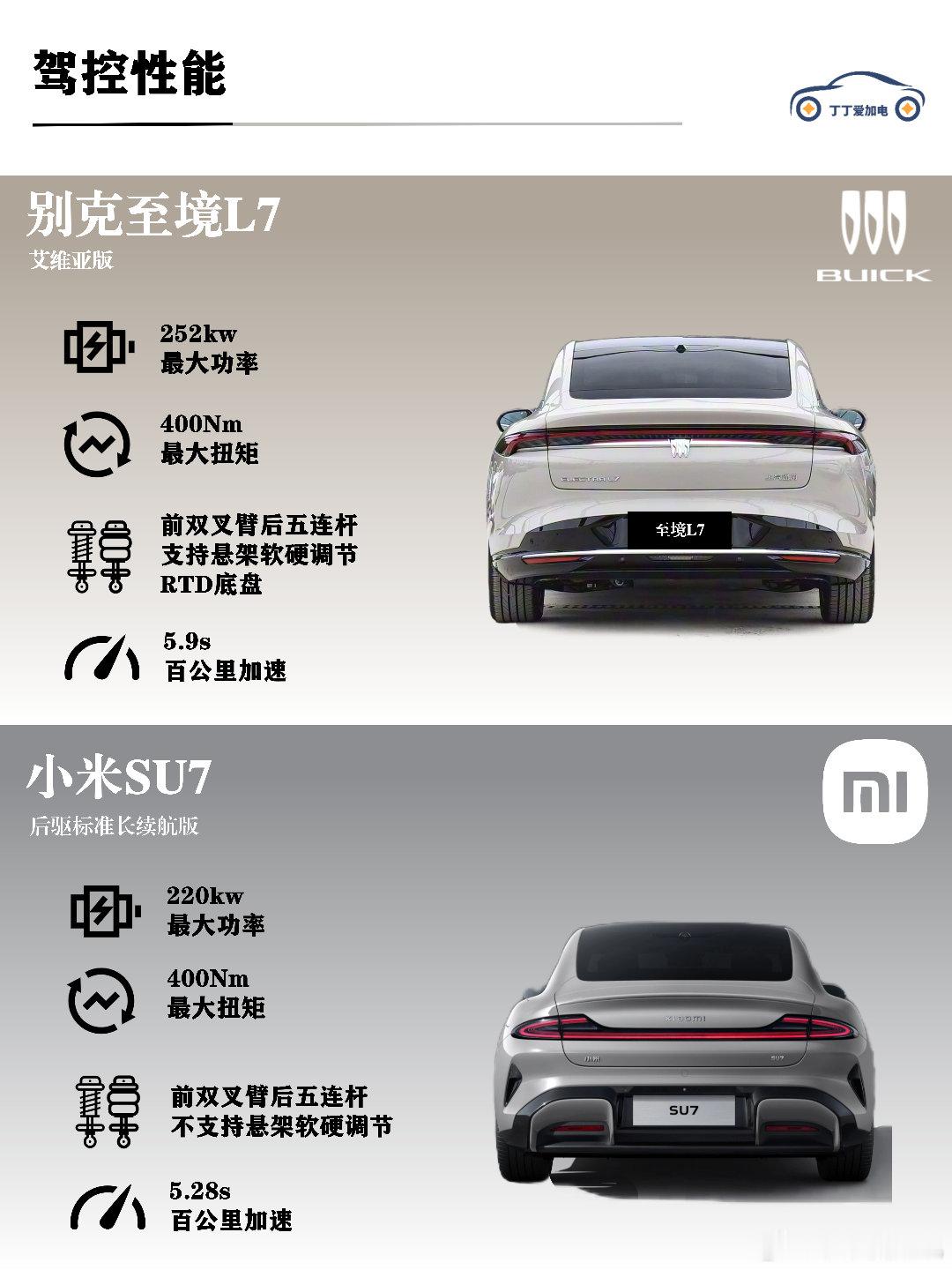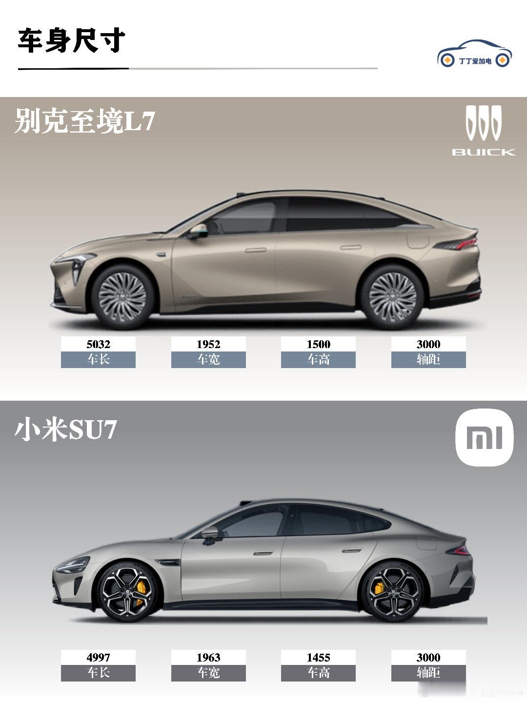 别克至境L7更像一位优雅的绅士,5米长的车身搭配流畅的线条,气场十足,堪比传统豪华车型56E。小米SU7则更运动年轻,低趴造型和溜背设计真的很吸睛~说实话,两台的颜值都在审美点上!