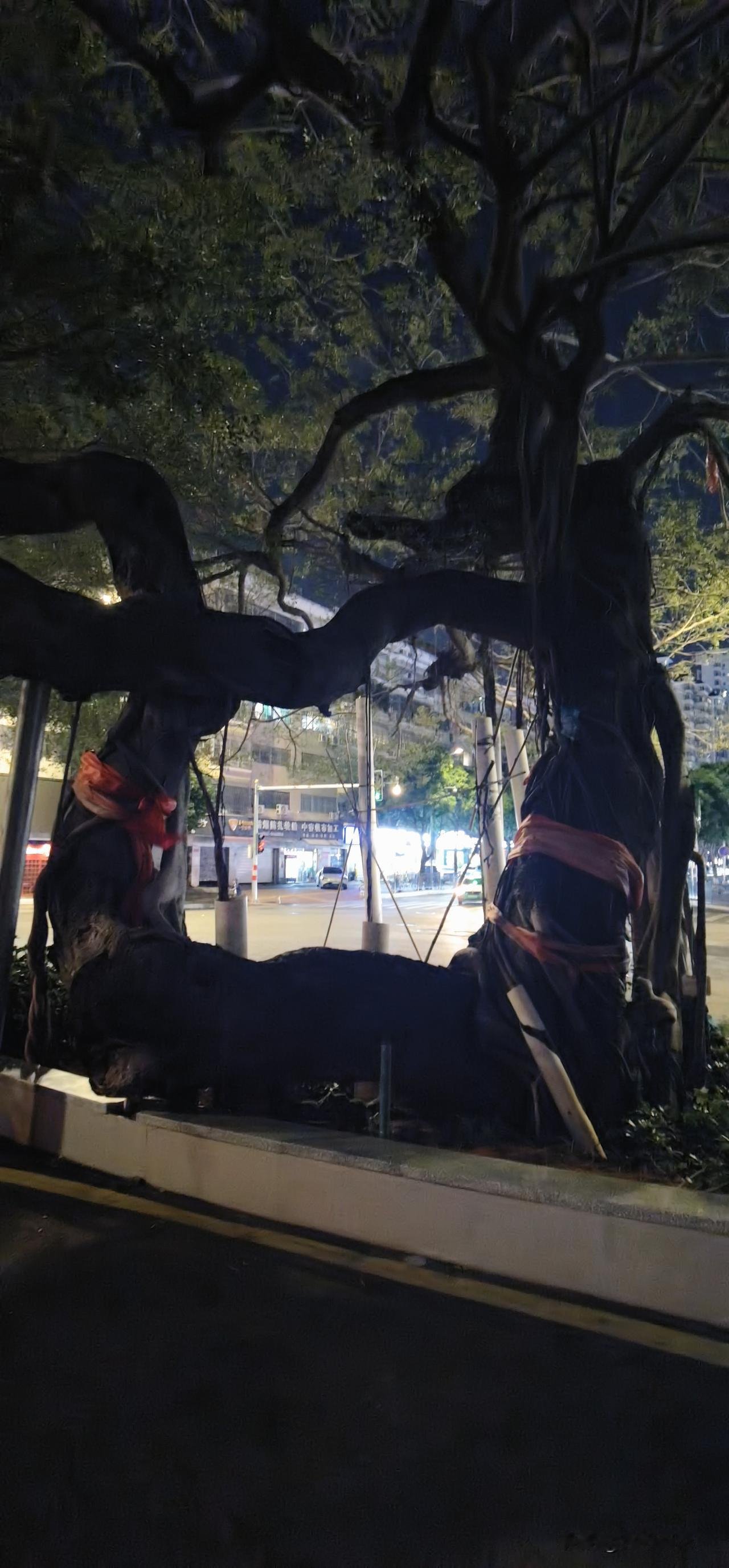 厦门|一棵把日子过成XO与闲话的奇树! 路过厦门江头,夜色漫过街角,就被一棵奇树勾了脚步。树干竟天然拧成个闭环,像大自然随性圈的标点,藏着说不清的巧思。 从左侧瞥去,那圆润弧线活脱脱是XO的“O”,连带着枝桠的弧度都像酒瓶颈,仿佛下一秒就要溢出清冽酒香;转到正面,闭环又成了“口”字型,枝桠轻摇,倒像这树在借着晚风絮叨江头的烟火琐事,憨态可掬。 上头枝繁叶茂得很,郁郁葱葱的绿攒成一团,把夜空遮出片浓荫。夜灯亮着,暖黄光线穿过叶隙,在闭环树干上淌出斑驳光影,“O”字添了朦胧醉意,“口”字似缀了星光碎语,连路过的晚风都忍不住绕着树转两圈,像是在听这棵江头“老伙计”的独家趣谈。