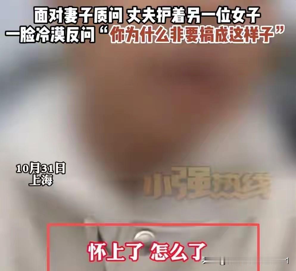 上海有一女子陪母亲去医院检查,在停车场偶然发现了老公的车。女子心生好奇,便在车旁等候。没过多久,女子老公从医院走出,朝着停车场走来,身旁还跟着一位漂亮女子,看样子这女子或许就是“三姐”。 女子突然出现在老公面前,老公一脸惊讶,问道:“你要干嘛?你怎么知道我在这儿?”女子回答:“我妈来医院检查,我陪她来,在停车场看到了你的车。”“三姐”被正主当场抓住,显得十分委屈。看样子,她和女子老公是来医院产检的。 女子一直追问“三姐”是否怀上了,把“三姐”问得哭哭啼啼、躲躲闪闪,一味逃避问题。女子老公全程站在一旁冷漠旁观,只说了句“可以了吧”,还责问女子为何要把事情闹成这样。女子反问:“是你把事情搞成这样的!”接着又指责老公:“你对家庭不负责,对孩子不负责,对老婆也不负责。”然后转头问“三姐”:“你会相信这样的男人吗?”又追问老公:“到底怀上了没?给句实话。”老公干脆地说:“怀上了,怎么了。” 女子还想看看“三姐”究竟长什么样,想瞧瞧她到底哪里比自己强,好学习学习。“三姐”却一直用双手捂脸躲闪。女子老公竟说:“肯定比你好。” 说真的,婚姻有时真让人感到悲观。当这男人说出“肯定都比你好”这句话时,是否还记得当初刚结婚时,两人满眼是对方、满心是欢喜的模样?曾经一文不值的承诺,不被尊重的灵魂,此刻都被他无情撕裂,着实令人痛心。换做任何一个女人遇到这种事,估计都难以冷静处理,即便内心想让自己平静,恐怕也做不到。 对此大家怎么看?