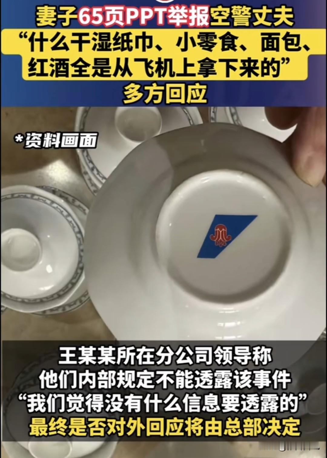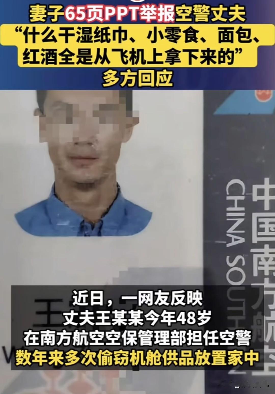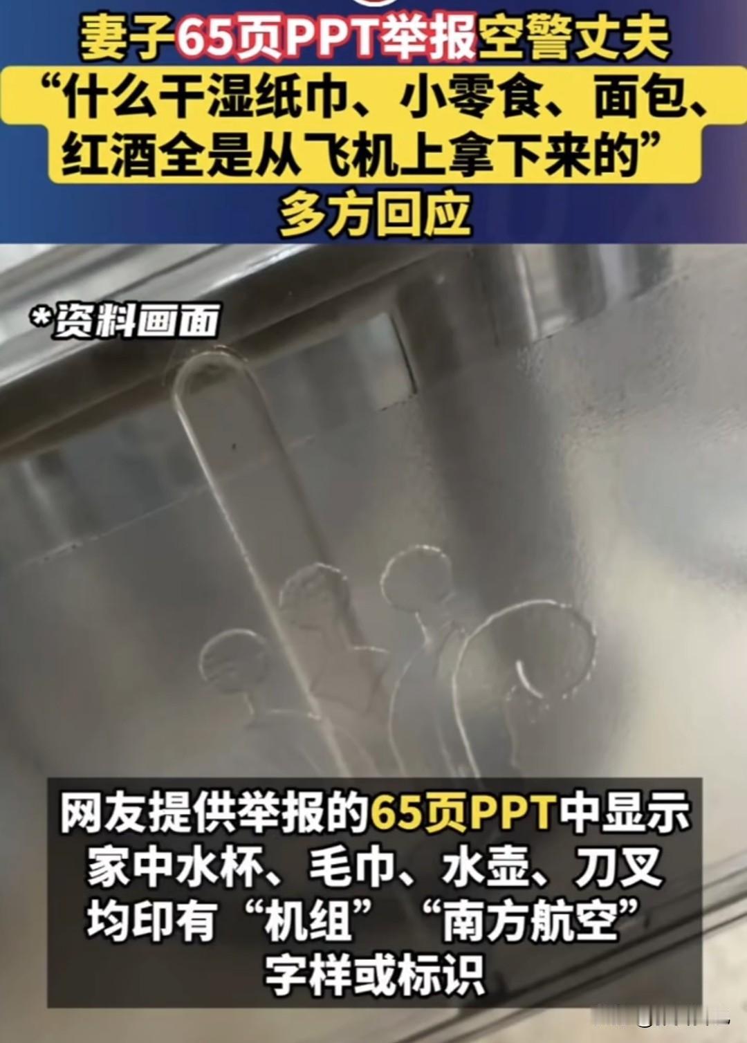 分享我这周有趣的事:近日,有一女子发 65 页 PPT,就为了举报自己在机场做空警的丈夫偷窃飞机上供应的物品! 该女子丈夫是南方航空空管管理部的一名空警,现年 48 岁,女子举报丈夫多年来一直偷拿这种有南航标识的物品,包括水杯、毛巾、刀叉及水壶等,所有物品上都有南航标识。 本以为其丈夫会被严厉处罚,没想到南航只回复:我们觉得没什么信息要透露的,最终是否要对外回应,也需总部决定。 有网友震惊不已:大妹子,这么爱家顾家的男人值得珍惜啊,为啥还举报? 拿单位东西是不对的,但作为妻子应该珍惜这种男人,至于要举报么? 有网友猜测:估计是她老公出轨了,但是向单位举报出轨不会对他的工作有影响,只是换了一种形式收拾渣男吧? 是不是还有一种可能:女的出轨了,想离婚,但没理由,只能拼命找男方过错? 估计很多人都以为举报劈腿出轨吧?这些玩意值几个钱,最多算占点小便宜,还至于六十多页ppt举报,这得多大的深仇大恨啊? 无论是哪种真相,举报两个字后面,都是不得不离婚的结局吧?