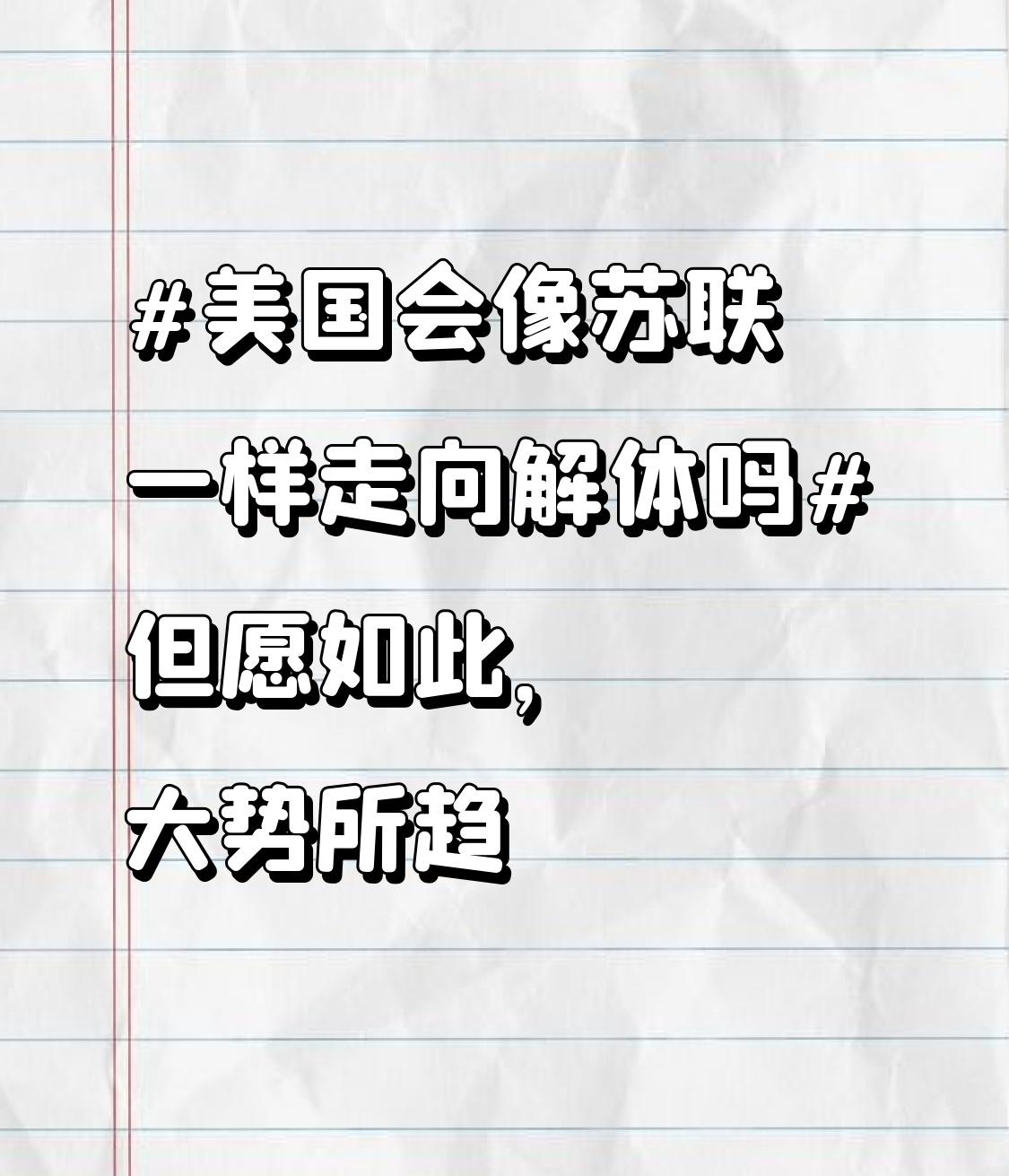 美国会像苏联一样走向解体吗?还真有可能。十几年前就有人预测美国会分裂,虽到现在它还是完整联邦,但内部问题不少。 从经济上看,加州GDP占全美14%,若独立就是全球第四大经济体,它却不想把税收送给“穷州”,2017年还讨论过独立公投草案,超三分之一民众支持。政治上,联邦和州矛盾凸显,像对非法移民执法,联邦与加州对着干,特朗普还放大族群矛盾,政治光谱红蓝对立,在移民等问题分歧大。俄罗斯专家帕纳林研究苏联解体后预测美国会分裂成三国,或许美国真在步苏联后尘,但愿它走向解体这一天早日到来。