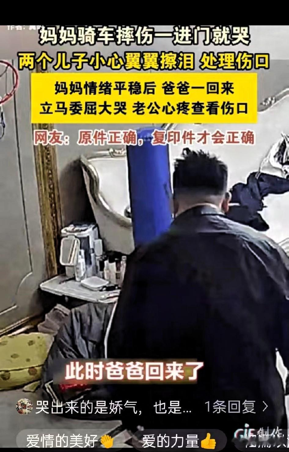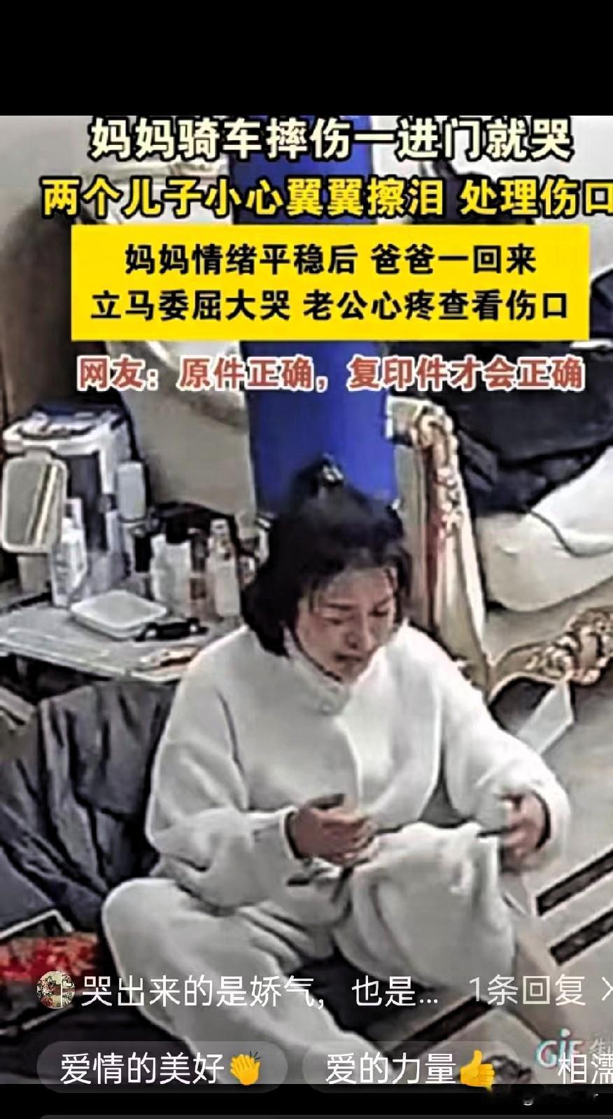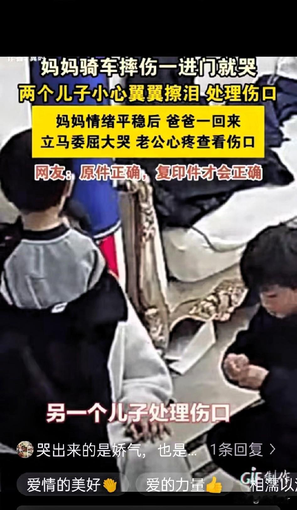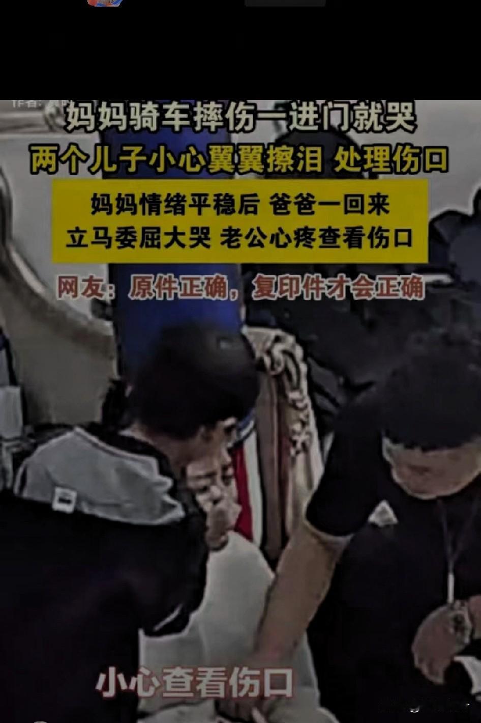 她估计是全网最幸福的女人! 浙江,女子在外骑车摔破了手脚,刚回到家就放声大哭,俩儿子的反应看哭全网!这才是家庭最好的样子 傍晚时分,她骑共享单车去接小儿子放学,路上为了避让行人急刹,连人带车摔在地上,手掌和脚踝蹭得又红又破,疼得直咧嘴。可一想到孩子还在学校等,她咬着牙爬起来,拍掉身上的灰,硬是撑着骑到学校把娃接回了家。 刚踏进家门,那股硬撑的劲儿瞬间垮了,委屈的眼泪止不住往下掉。俩儿子本来在客厅玩玩具,一听妈妈哭赶紧跑过来,看到妈妈手上脚上的伤口,小脸上满是着急。大儿子没多说,转身就去抽屉翻碘伏和棉签,蹲在妈妈脚边,小心翼翼地蘸着药水擦伤口,还小声安慰:“妈妈别怕,我轻一点,很快就好。”;小儿子则攥着自己的小毛巾,踮着脚帮妈妈擦眼泪,软乎乎地哄:“妈妈不哭,我给你吹吹就不疼了。” 孩子爸爸听说老婆受伤,正在外面办事的他立马推掉手里的事往家赶,进门第一句就是“哪里疼?让我看看”,看着伤口时眼里的心疼藏都藏不住,还赶紧找创可贴帮她贴上。刚平复点情绪的妈妈,见着老公这模样,眼泪又掉了下来——这次是感动的泪。 有人说这妈妈运气好,可我觉得这份幸福不是凭空来的。爸妈恩爱,家里处处是暖意,孩子才会耳濡目染学着疼人;妈妈知道背后有人护着,才敢卸下“坚强”的壳。这种一家人互相牵挂的模样,比任何甜言蜜语都让人羡慕!