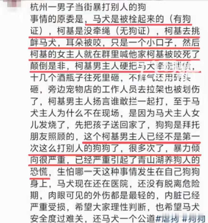 “人不可貌相!”杭州青山湖,一只拴绳马犬被柯基挑衅轻咬,柯基主竟抡酒瓶砖头砸狗20分钟,内脏出血命危,自己却撒谎“它咬死我儿子”,网友:先撩者贱,暴力必须买单! 据头条新闻11月1日消息,10月29日晚,灰衣男牵柯基路遇拴树马犬,柯基未拴绳冲前挑衅,被马犬回咬耳尖小伤,马犬主提议先送医后协商,因女儿发烧暂离,灰衣男趁机施暴。 目击者称,男子边踹边喊“杀子之仇”,女友附和“咬死我们狗”,酒瓶砖头齐下,围观误以为真,无人敢拦,持续20分钟直到警方到场,电动车也被砸烂。 宠物店员工劝阻遭误伤,提醒找主人谈赔偿,反被威胁“谁拦打谁”,嚣张气焰全场咋舌;马犬主返回只见爱犬倒地,送医检内脏破裂尿失禁,至今未脱险,医药费全自垫。 警方立案后,网友扒出男子系当地大学生,曾摔死前柯基“甘蔗”,新柯基仍同名,女友恋爱脑秀恩爱;两人住址曝光,圆脸眼镜合照与街头暴行反差极大,小区住户指其常因狗事报警。 事件引爆“合规养宠”热议,众人呼吁立法严管暴力,拴绳守法者不该为挑衅埋单,谎言更遮不住错误,遇事冷静走合法途径,方能共守和谐秩序。 对于这件事情,大家有什么看法?
