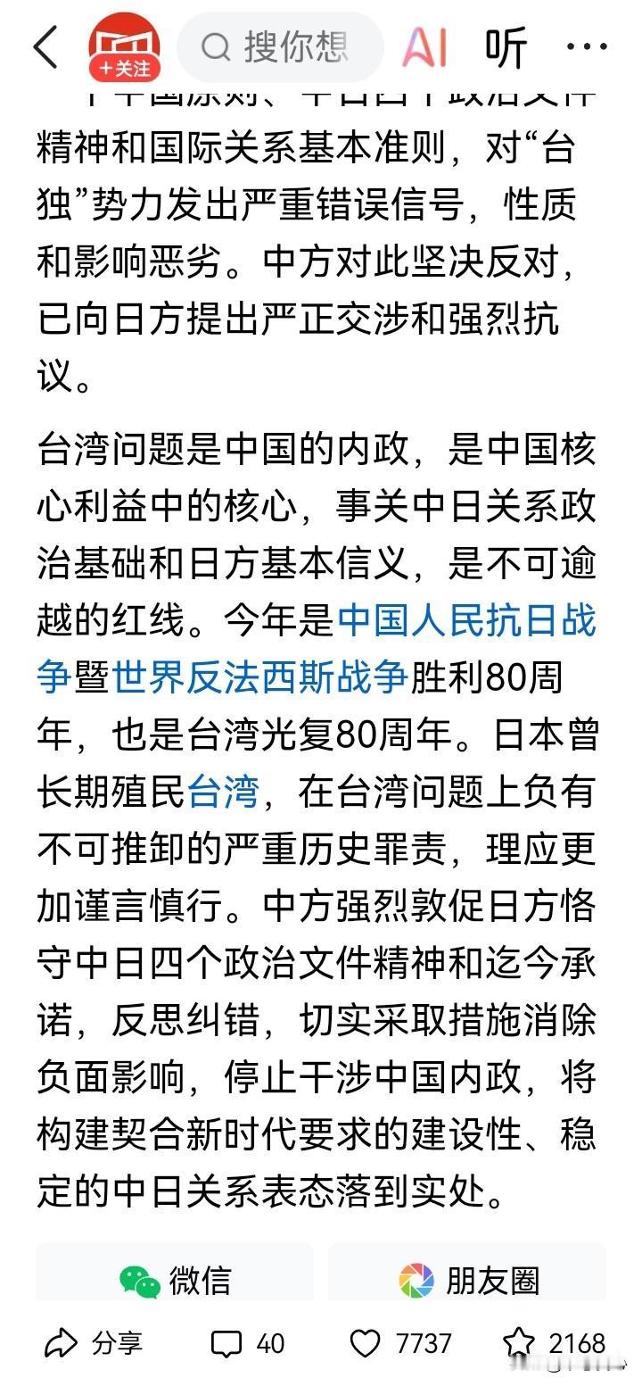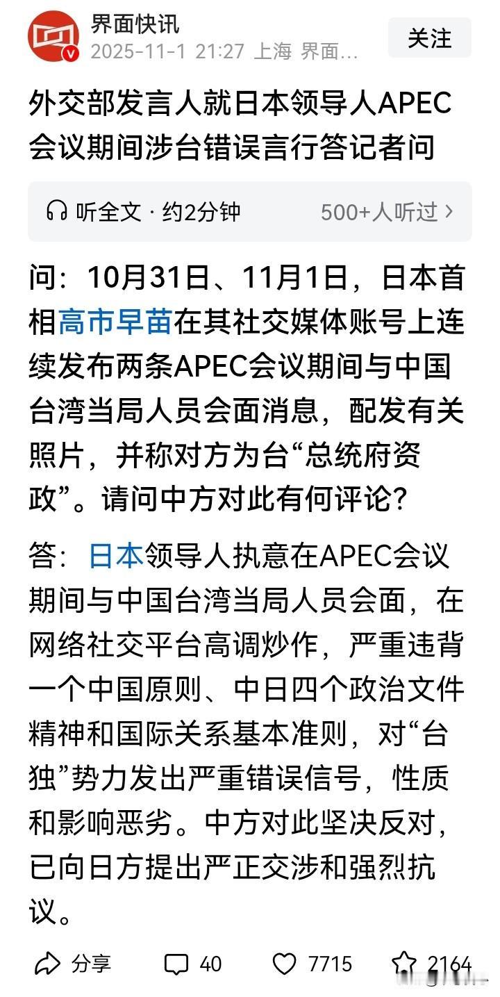 日寇狼子野心不死,此人当了首相时,我们没有发贺电是对的。 此人当了首相后,记得有记者几次提问我们的外交部发言人,问有没有发贺电,会否发贺电的问题。发言人的回答,大意是通过相关途径表达了。 其实,发贺电,那肯定是祝贺;“表达”了,首先可能没有安排高级别的人员,另外,也可以是“朕知道了”,表示知道你当了首相。 至于为何没有发贺电,大家都知道,此人有参拜靖国神社等行径,对我们不友好等等。 此次,在韩国APEC期间,她就一方面与中方会面,另一方面又与中国台湾当局人员会面,还在网络社交平台高调炒作,性质和影响恶劣。 日寇曾长期殖民我国的台湾省,二战战败后,才把台湾交回我国,可以说,他们有严重的历史罪责,理应谨言慎行。 他们没有谨言慎行,却再次违反规则,只因他们的狼子野心不死……