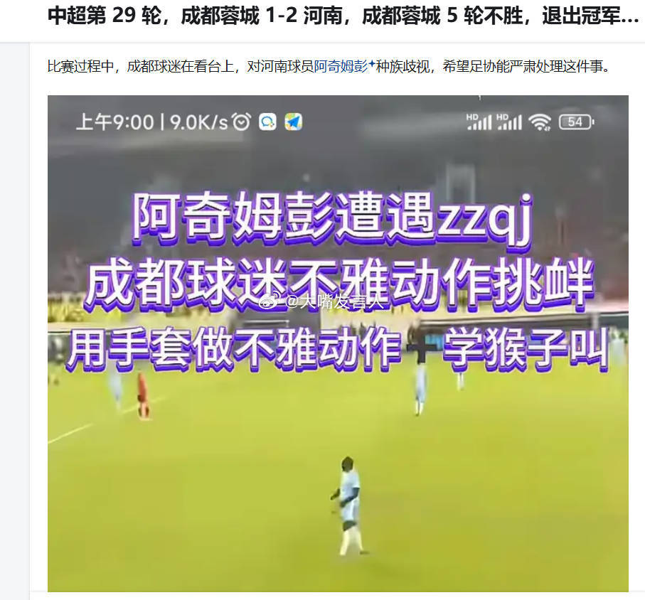 警方通报2球迷中超比赛做侮辱性动作 应该是昨天晚上比赛中,主队球迷侮辱客队河南足球俱乐部外援非洲加纳球员“阿奇姆彭”了吧(图3至图6是阿奇比赛中)[怒][怒]