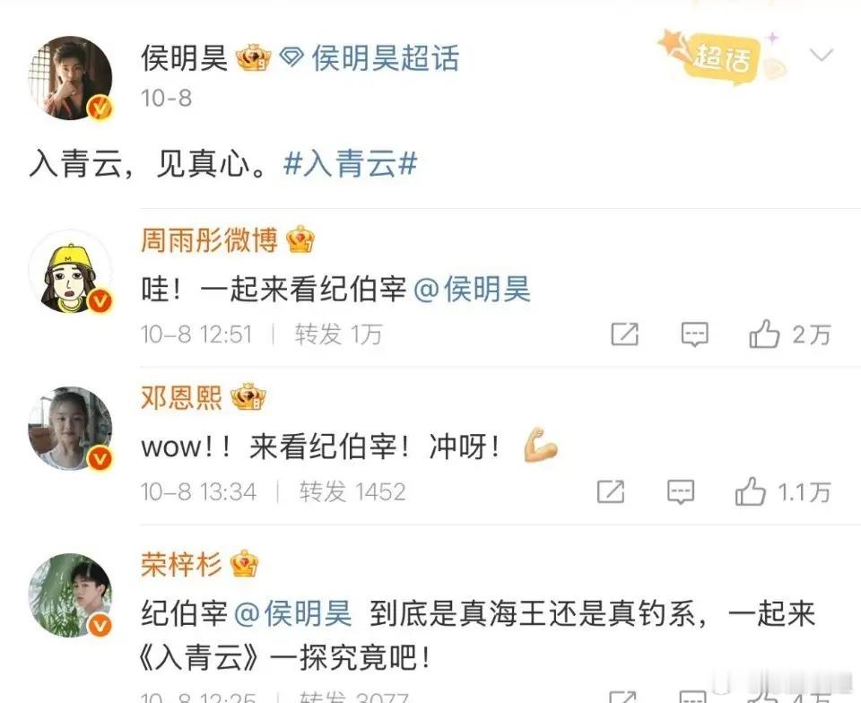 侯明昊《入青云》上线周雨彤、邓恩熙、荣梓杉转发宣传!