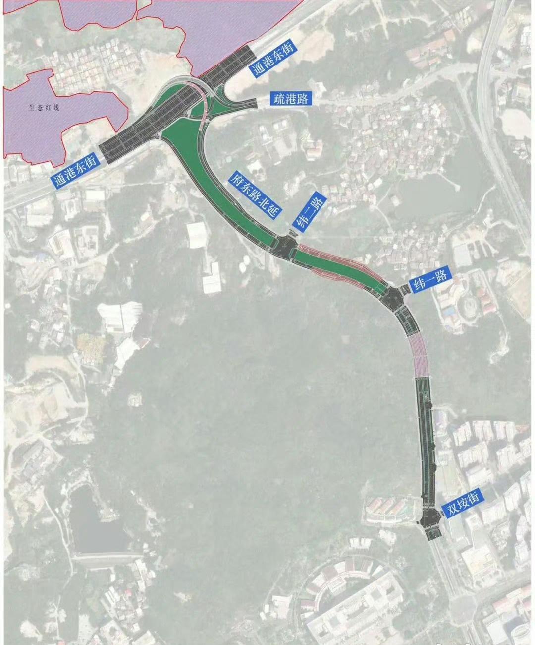 下穿桃花山泉州东海新隧道即将开建连接东海-城东府东路北拓(北段)即将开建,:府东路北延伸段(北段)位于丰泽区,起于纬一路交叉口,主线设置桥梁上跨纬二路地面交叉口,桥长约471m;设置桥梁上跨通港东街,桥长约145m;并对通港东街互通进行局部改造,设置分离式隧道下穿桃花山(右线隧道长约2750m,左线隧道长约2760m);终于安吉路大坪山隧道口,设置安吉路菱形互通,桥长约284m,桥两侧设置地面辅道接安吉路。