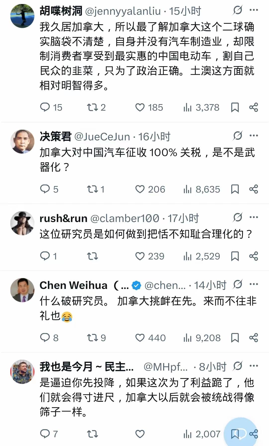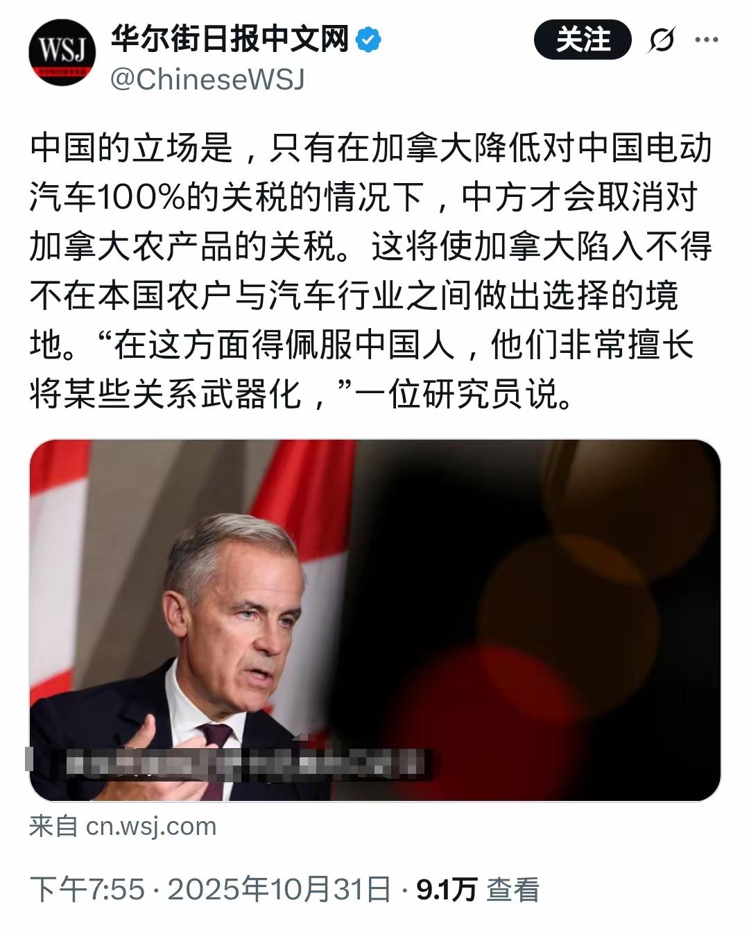 加麻大这是又把叶子抽多了吗?你先加我汽车关税,我反制你一下,让你肉痛了。你想让我们取消反制措施,肯定你得先取消对我们的关税表现你的诚意我们再来谈啊。 你先动手,当然你得先道歉。这当然是我们中国的立场咯。这不是我们擅长将某些关系武器化,这么说就说明这个研究员真的白研究中国了。 我们中国人最擅长的是:人不犯我,我不犯人,人若犯我,我必犯人! 懂了不? 你要讨好美国,先对我挑事,打我一巴掌,结果没有想到我会踹你一脚。这个时候你倒委屈上了,觉得我不该踢你。 在想啥呢?为什么这些货都没有自知之明? 点右上角关注我,我们一起去看这个魔幻的世界