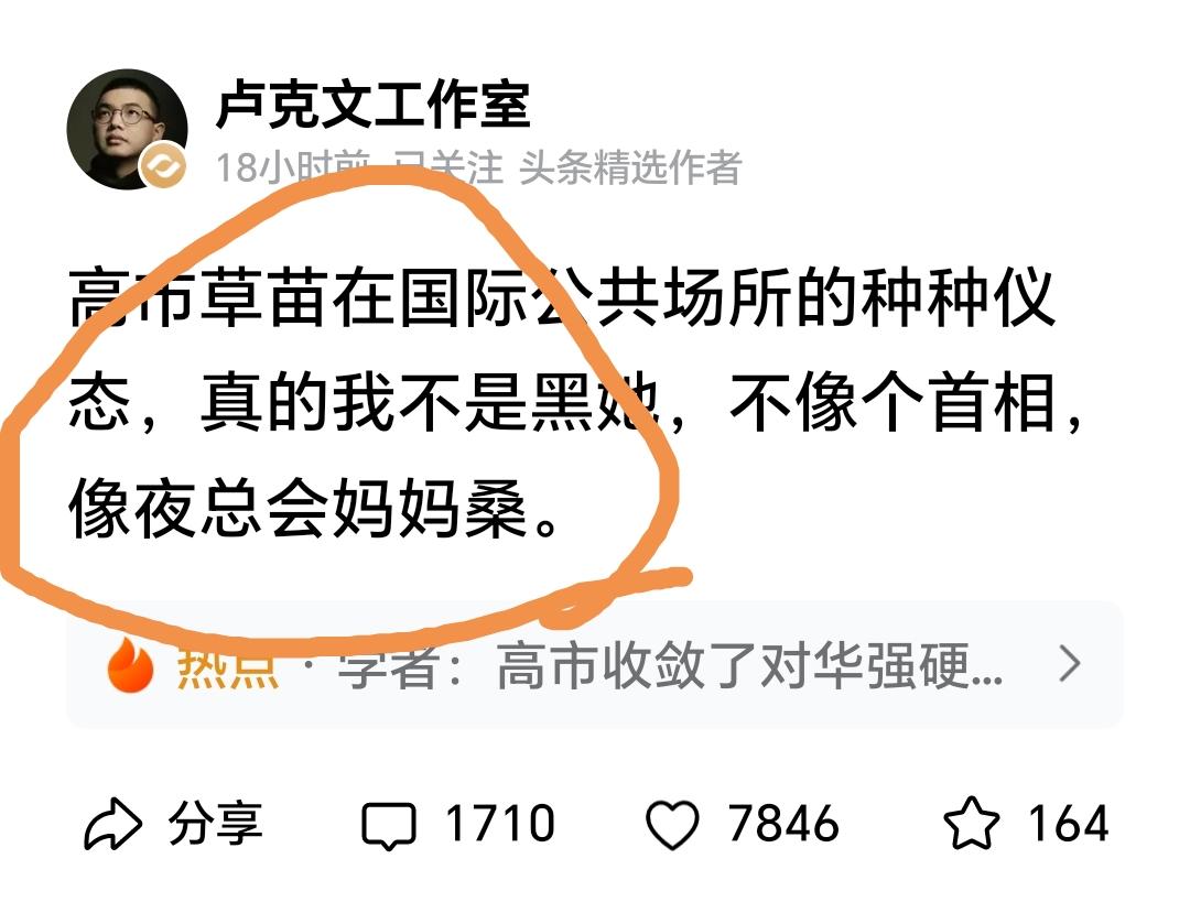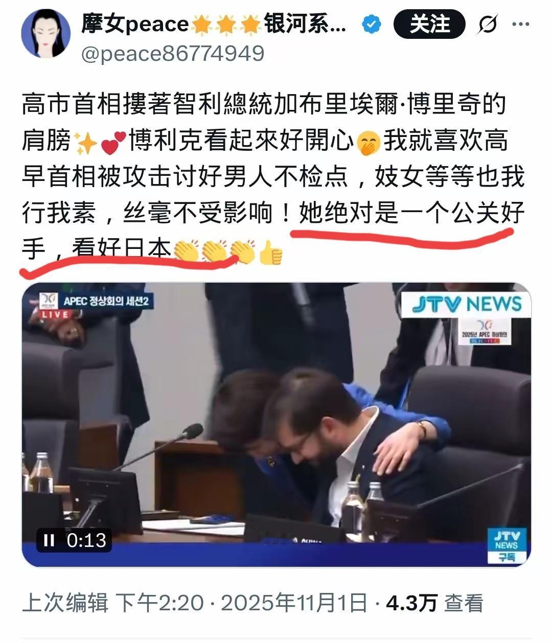 看来大家都还是有共识。卢克文认为搞事早夭像夜总会妈妈桑,我称之为“花痴外交”,从她连续贡献的三个外交名场面来看,我认为卢克文说的有道理。 至于有人认为这对日本未来有好处,且看吧,毕竟上一个贡献外交名场面的安倍已经为日本捐躯了。 既然搞事早夭被称为女版安倍,就看她对日本的忠诚度有多高了,愿意为日本付出多少了。 点右上角关注我,我们一起去看这个魔幻的世界