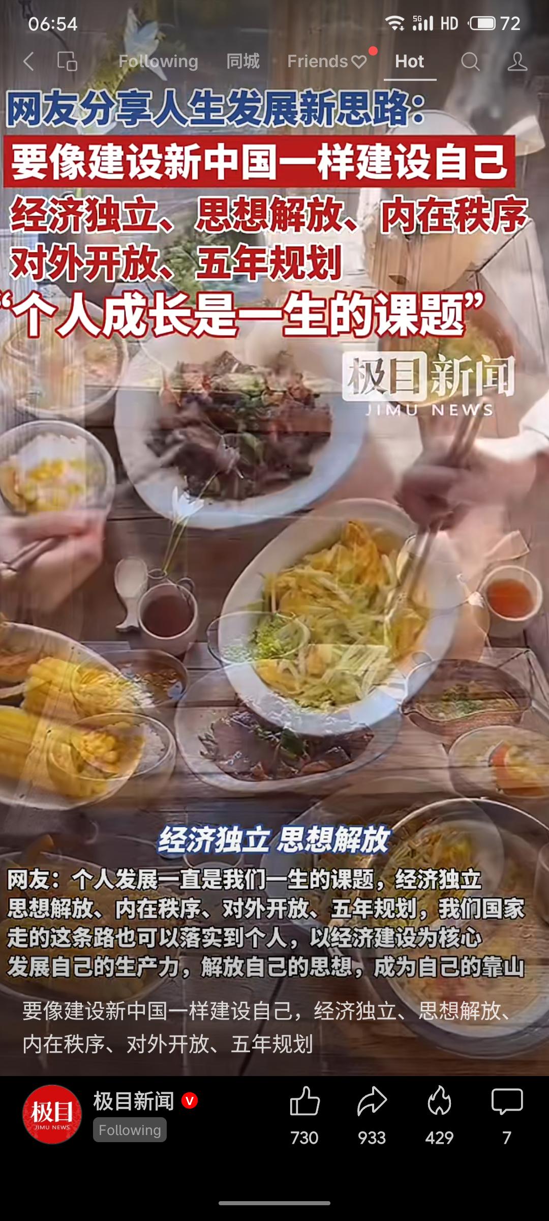 网友提出个人发展新思路:借鉴国家发展模式,以“经济独立、思想解放、内在秩序、对外开放、五年规划”为框架,系统建设自我,将个人成长视作一项需要长期投入的终身课题。