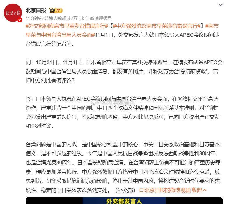 外交部回应高市早苗涉台错误言行,高市早苗与中国台湾当局人员会面,热点观点