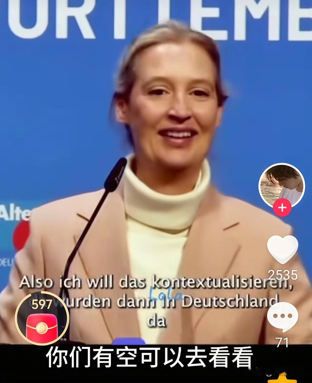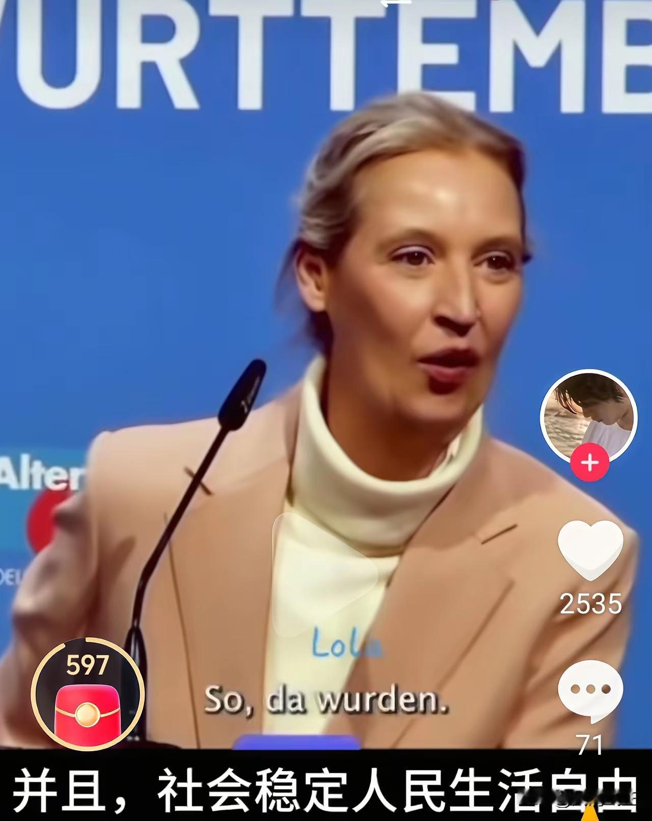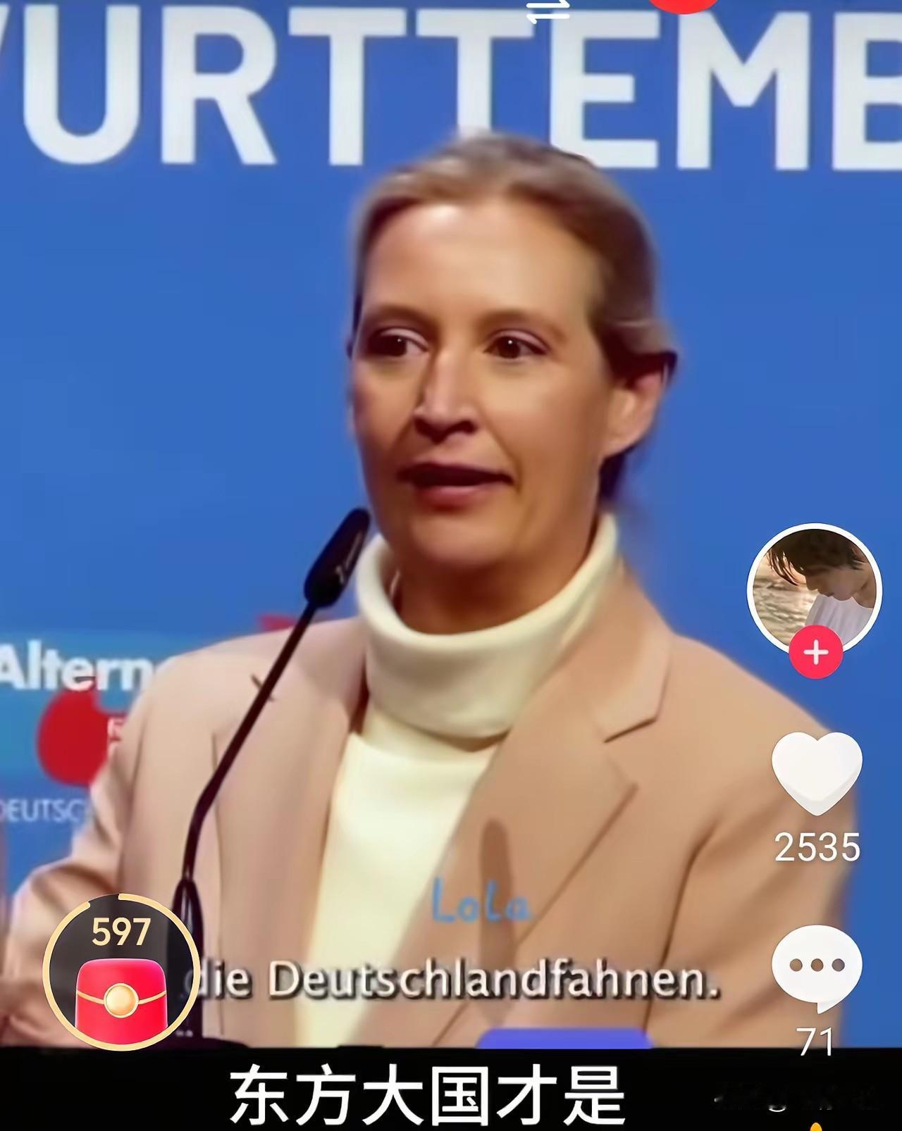 当德国的魏德尔在演讲中问到:我们还是工业强国吗? 全场鸦雀无声,曾几何时,工业强国可是德国的代名词,当她回答说,不!现在的东方大国才是工业强国(全场现惊叹声)! 明白透彻,魏说出了真话实话、一针见血。 她是一个实事求是的德国政客,不抹黑不造谣不中伤中国的政客。 话说欧洲现在的政客,特别像中国文革时期的左派。什么都以政治正确和共同价值观为中心,大搞意识形态。就差喊出宁可要资本主义的草,不要社会主义的羊了。抛弃了前英国首相丘吉尔的“国家间确实没有永恒的朋友,也没有永恒的敌人,唯有永恒的利益。”的思想。可悲可叹!