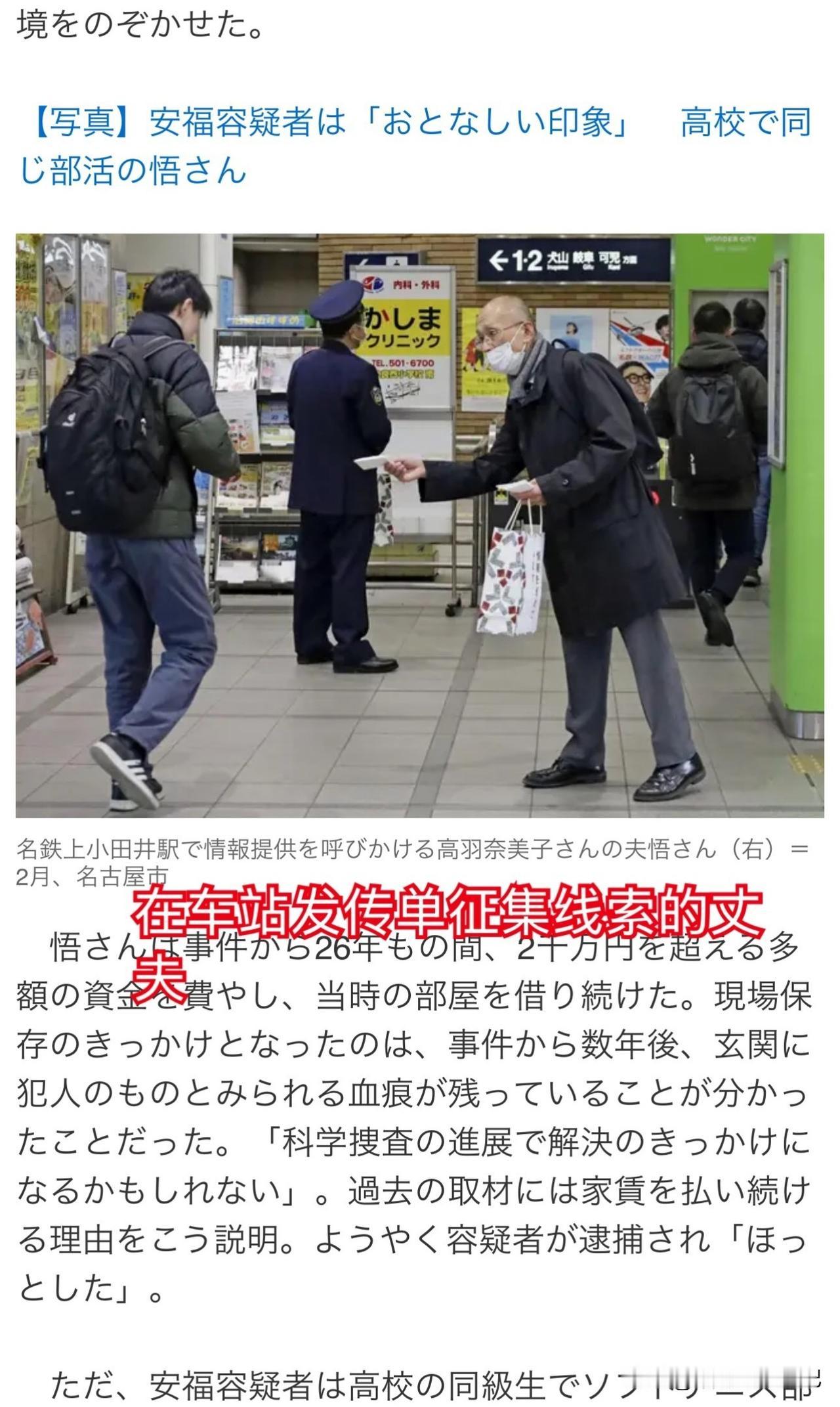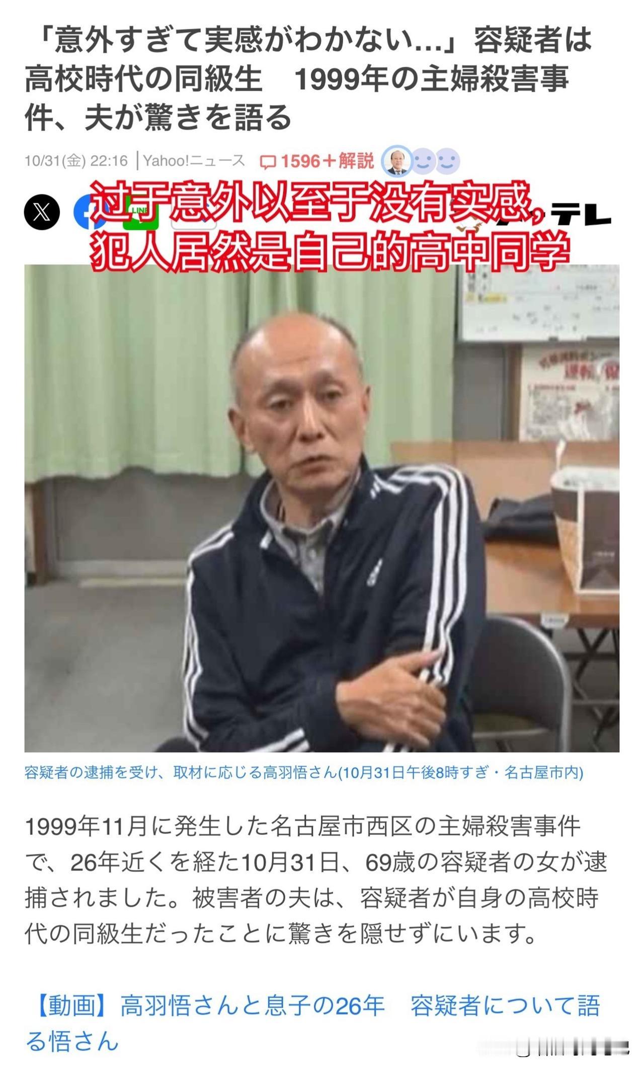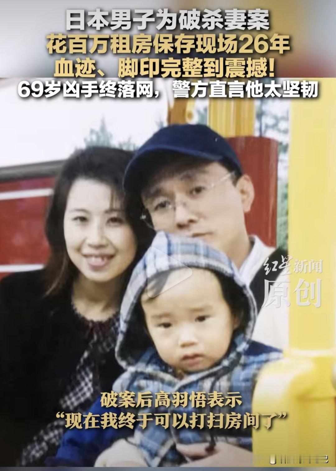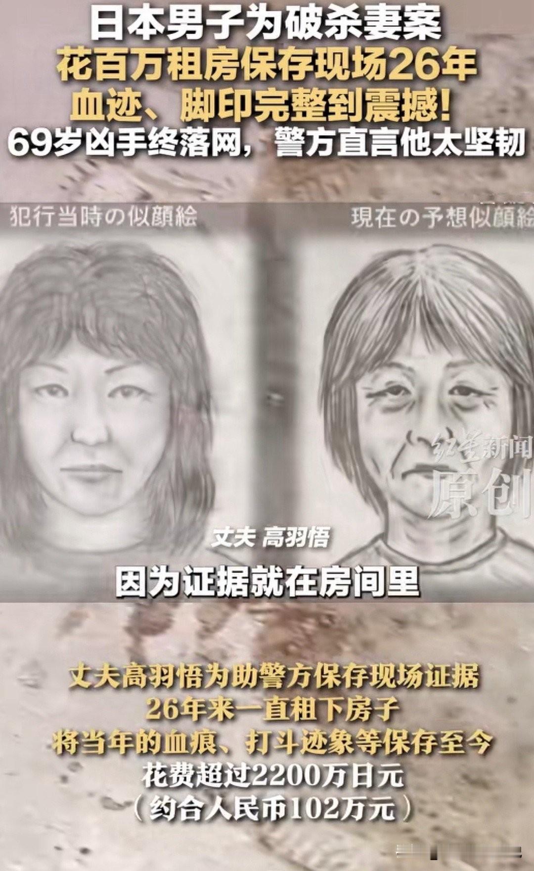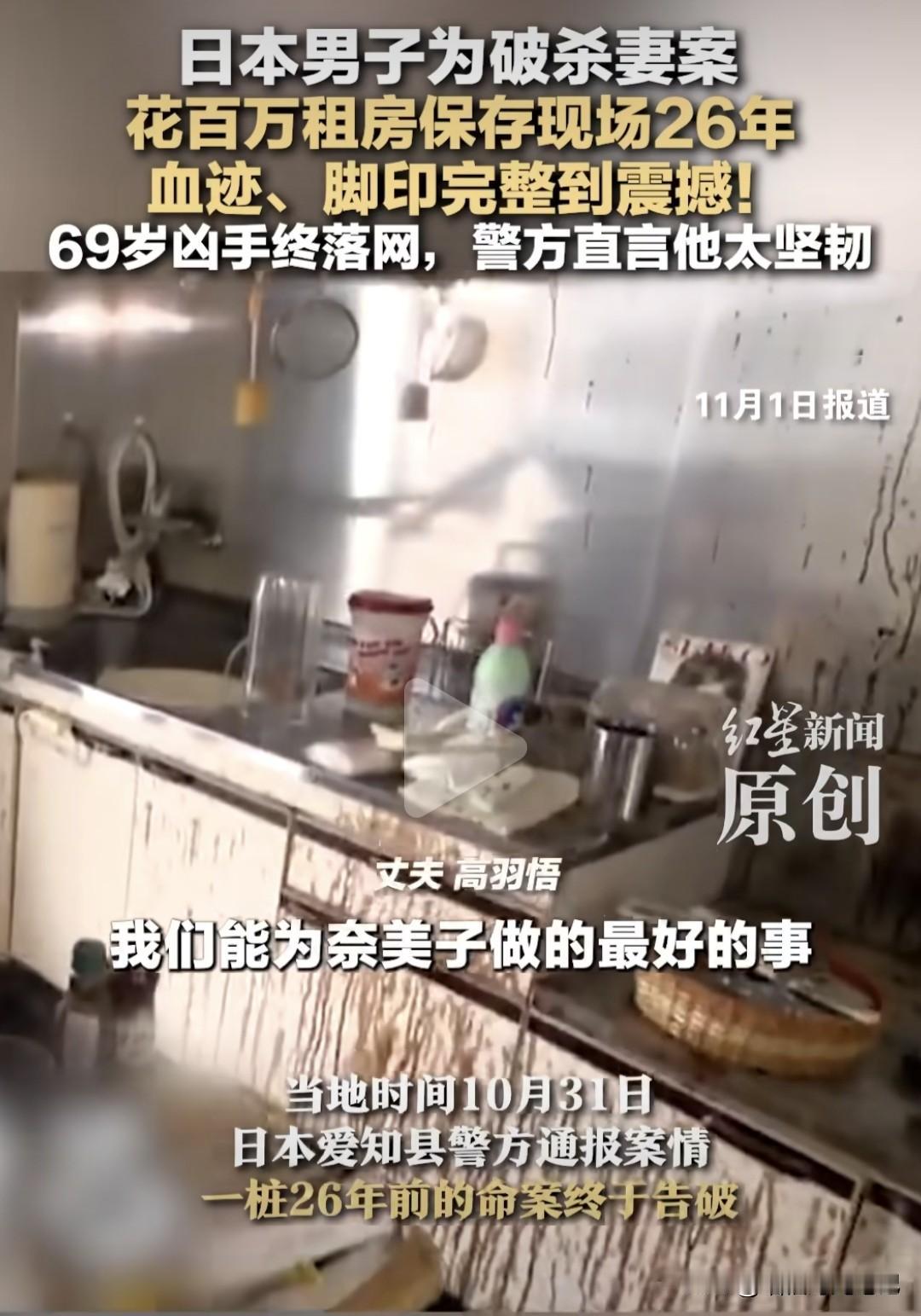 26年未打扫,花费百万,死守案发现场。用近乎偏执的坚守,为亡妻讨一个迟来的真相。日本名古屋1999年11月,一栋旧公寓的玄关,32岁的奈美子遇刺倒在血泊里。2岁儿子航平,没受伤,却眼神空洞的说了一句话把所有人吓到:“妈妈和陌生阿姨吵架,然后妈妈死了。” 丈夫高羽悟赶回家,只见妻子眼镜掉落,脸歪向一侧,让他当场崩溃。更绝望的是,警方排查5000多人,动员10万警力,DNA技术却卡壳,案子一悬就是26年。 换别人早搬家了,可高羽悟偏不。他咬牙续租凶宅,一租就是26年,房租加维修砸进去2200万日元(约人民币110万)。玄关血迹、打斗划痕、妻子挂在椅背的外套、1999年的日历,全都原封不动。专家一句话点醒他:“地上那滩血,很可能是凶手的。”他就用塑料膜盖着,天天等科技进步,也等凶手露马脚。 2025年10月30日,69岁的安福久美子忽然走进警署:“我杀了人。”DNA一比,现场血迹就是她留下的。更狗血——她竟是悟的高中同学,还一起打过软式网球。动机警方只透露俩字:“私情”。悟听完苦笑:“原来她躲在我记忆里最不起眼的角落。” 26年,儿子长大成人,悟从青丝等到白头;26年,日本废除杀人案时效,他推动的;26年,他第一次走进那间屋子,不是为了守护,而是为了打扫。“终于可以擦地了。”悟说这句话时,泪比血重。 高羽悟用26年的孤寂坚守,兑现了“正义或许会迟到,却永不缺席”的誓言。正如媒体所叹:他守住的不仅是一间屋子,更是让妻子存在过的痕迹永不磨灭的承诺。 评论区聊聊,你觉得悟这26年值吗?换作是你,会守着凶宅等真相,还是早点开始新生活? [图源网络] 今日所见所闻