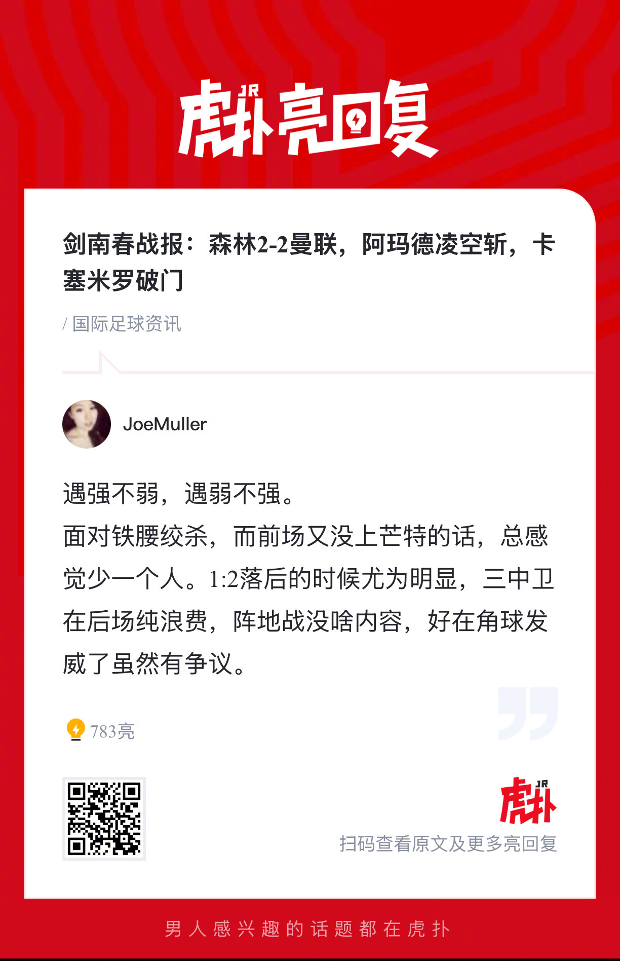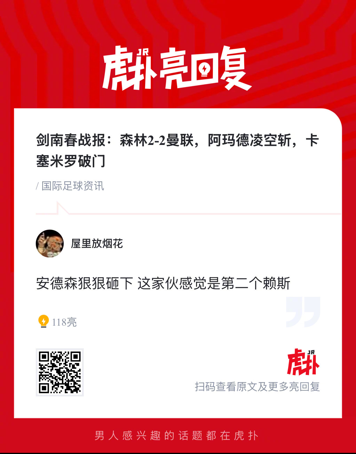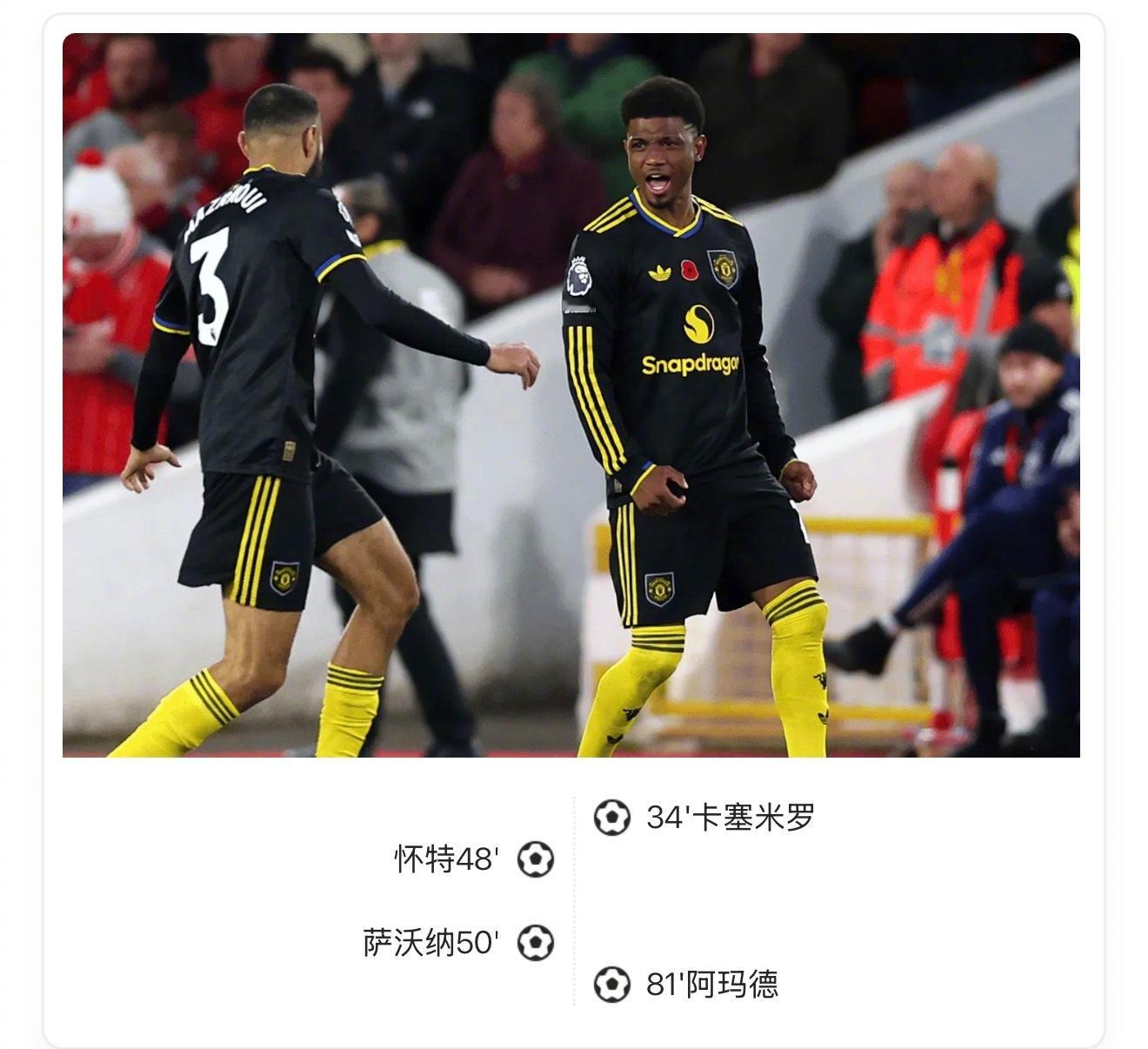 【战报:诺丁汉森林2比2曼联,阿玛德凌空斩,卡塞米罗破门】比赛第34分钟,卡塞米罗头球破门打破僵局。48分钟,吉布斯-怀特扳平比分。2分钟后,萨沃纳反超比分。81分钟,阿玛德世界波凌空斩破门。
