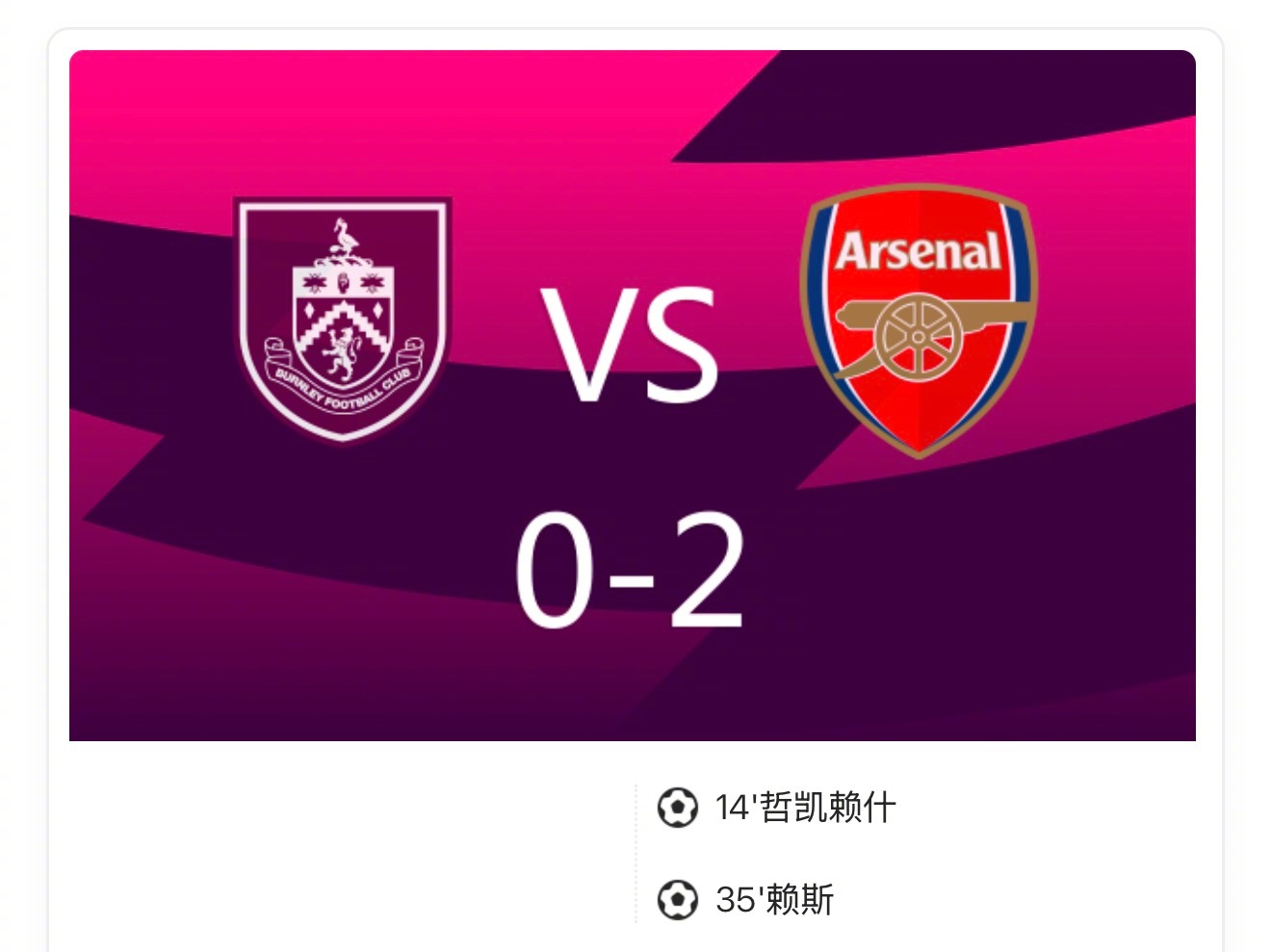 【战报:伯恩利0比2阿森纳,哲凯赖什、赖斯头球建功】上半场哲凯赖什头球破门首开纪录,随后哲凯赖什策动特罗萨德助攻赖斯头球破门。