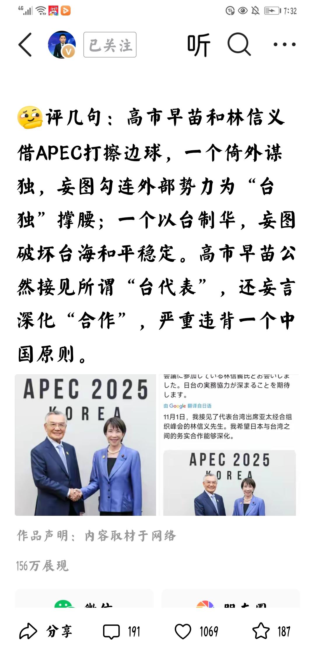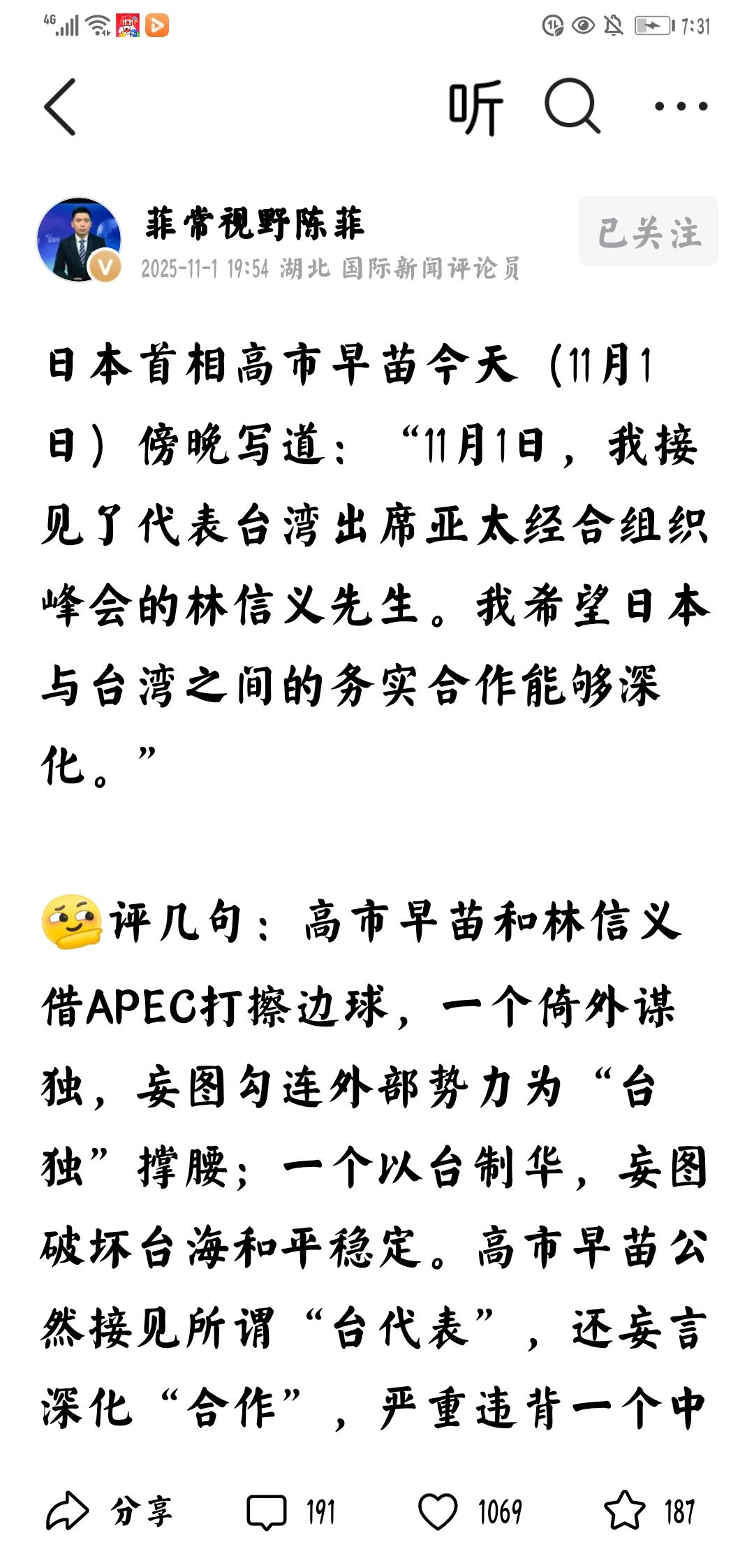 高市早苗:蓄意挑拨 个人观点:这是蓄意挑拨,试探中国的底线,了解中国的反应。德国外长发表涉台不当言论,荷兰非法占有安世半导体,现在又有日本首相蓄意挑拨。 看来,必须斩立决,否则还将继续挑拨中国底线。